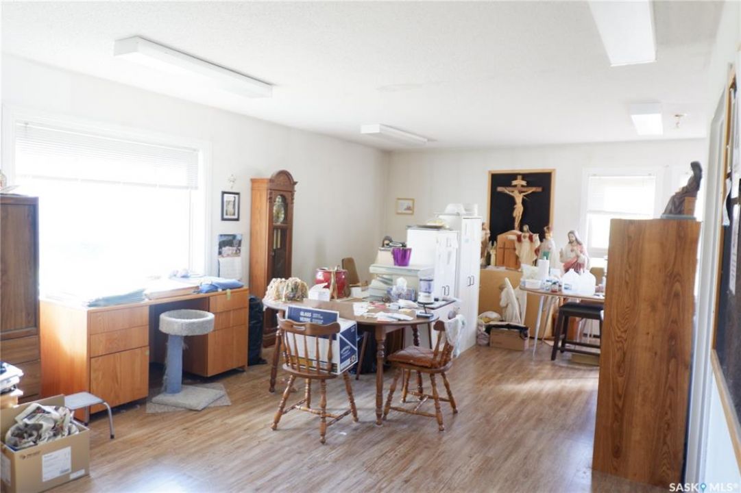 A beacon of faith and community is now available. This very unique property could be yours! This beloved Catholic Church has served as a spiritual home for gerations. This is a fully functionable Catholic Church with 2 attached residences. The Catholic Church was moved to the present location and two adjoining suites were added later. A triple detached garage was constructed and a Manufactured home was moved onto the property. Heating to the Church and residense is Natural Gas Hot water boiler in-floor heat. There is also a large Generator connected to the property. The Church is stunning and you can feel the comfort when you enter through the rounded Custom doors. There is plenty of room for a large gathering with 30 large pews. A full altar and choir area is at the front. There is lots of storage behind the altar and in the back utility room. The front has a den to the one side and access to the living quarters to the left. There is a small loft for storage. The living quarters cons1ist of a 1-bedroom suite with an l-shaped living/dining/kitchen complete with laundry. The second suite has several small room, a litkcen and a large bedroom. Each suite has a full bathroom and there is a bathroom in the entryway to the living areas. The triple detached garage has 2 overhead doors. The manufactored home was added later. It is open design concept, 2 bedrooms, bathroom and laundry. All the buildings are in excelent condition. The land is 60 acres of organic hay. This convenient location is directly on highway #2, 35 kilometers south of Moose Jaw. The owner would love to see a Catholic group continue with the Church in this location. Come check it out today.