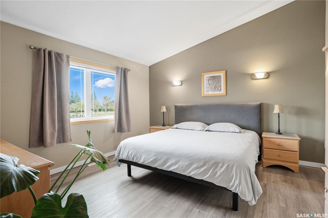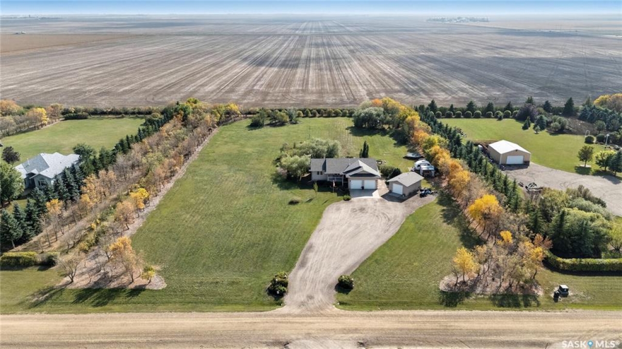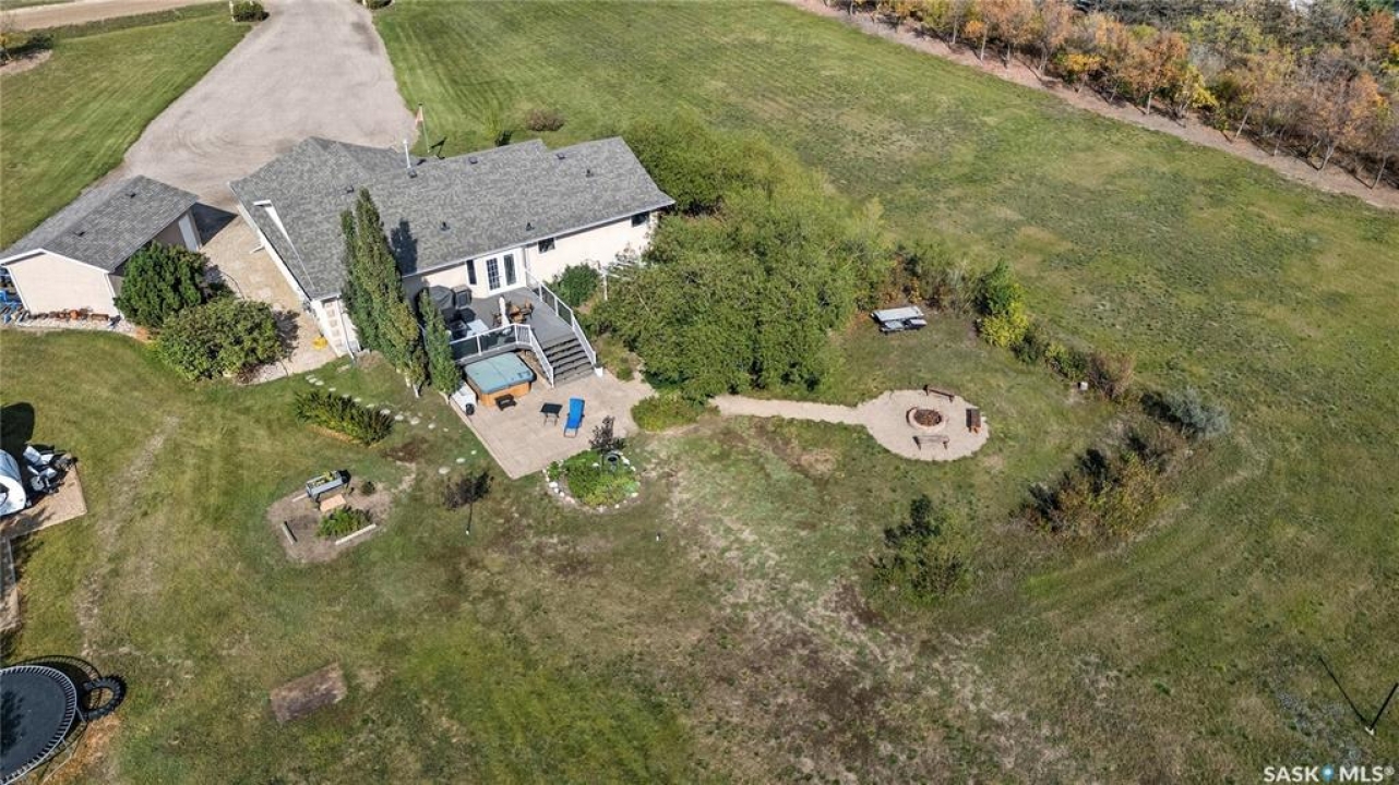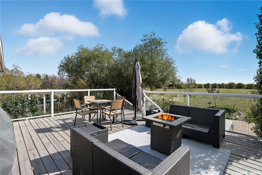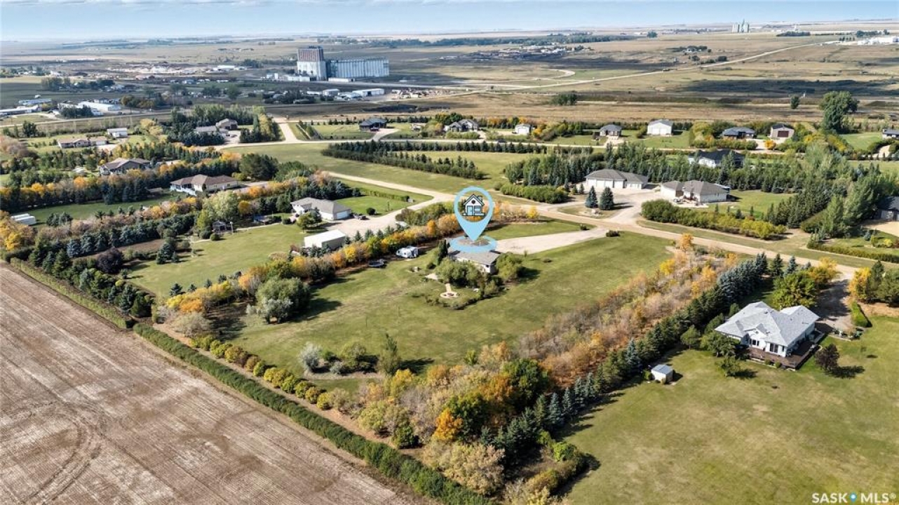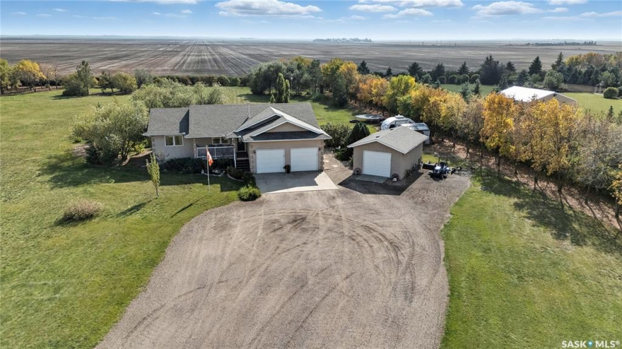 Tucked into Valley Ridge Estates and surrounded by mature trees, shrubs and natural screening! This private 2.77 acre property offers country living, while being only seconds away from Moose Jaw city limits and walking distance to the brand new Coteau Hills elementary school. Built in 2002 and lovingly maintained, this home features a comfortable main floor with an open concept kitchen/dining and living room featuring vaulted ceilings and a gas fireplace. The primary bedroom boasts a generous ensuite with a Jacuzzi tub, standalone shower and a large walk-in closet. Another full bathroom, a separate laundry room as well as an additional bedroom complete the main floor living space. The fully finished lower level is bright and airy thanks to the oversized windows found throughout. A large family room, three additional good size bedrooms and another 4 piece bath with jacuzzi tub complete the lower level. The double car attached garage plus an additional 16' x 24' detached garage provide ample storage for all of your toys and equipment. The rear of the home features a large south facing deck and a lower patio area perfect for entertaining or enjoying your hot tub(included). This home is move in ready, the only thing left to do is put your feet up and enjoy the peace and tranquility. Recent updates include shingles (2020), new furnace (2024), hot water heater (2022), new flooring in basement (2017), new flooring upstairs (2019). Property is on Municipal water.