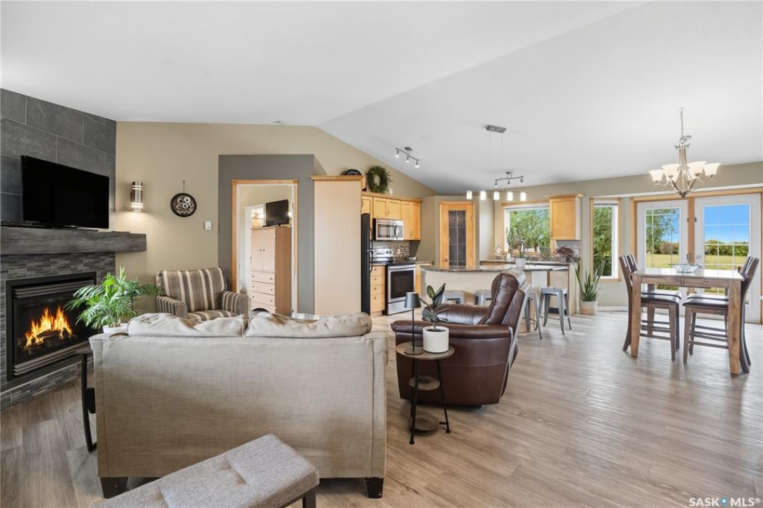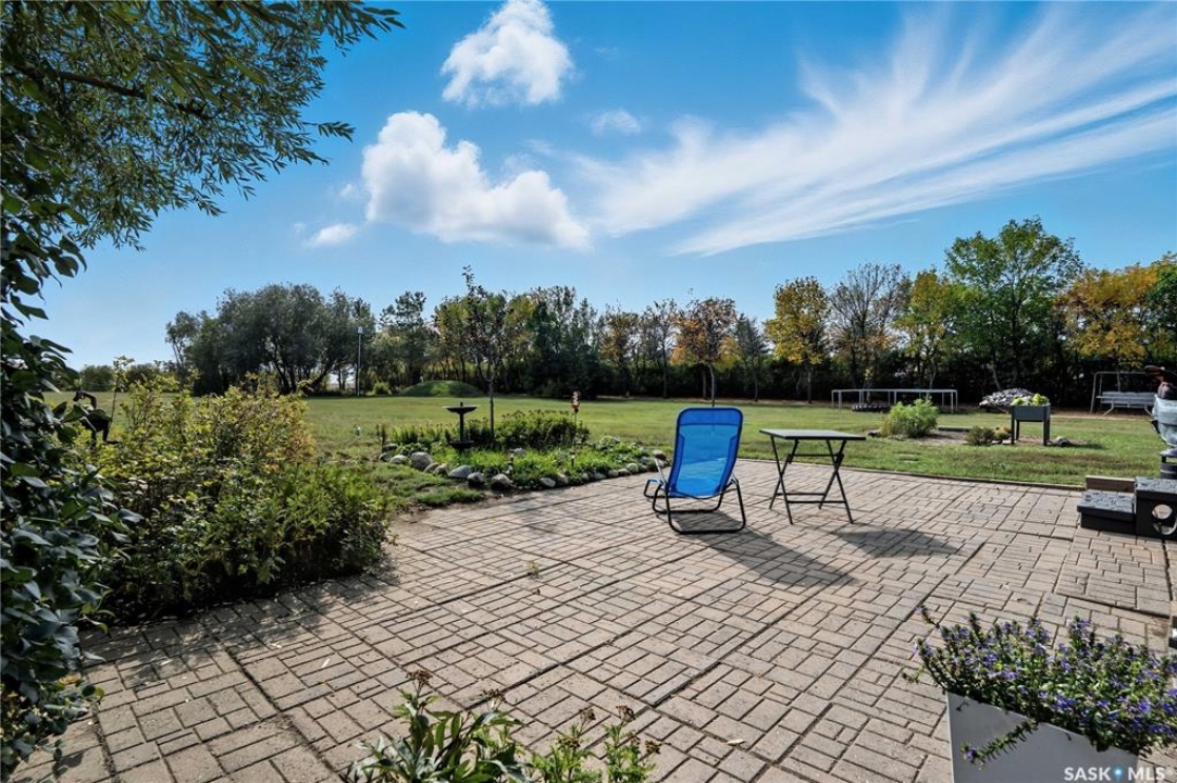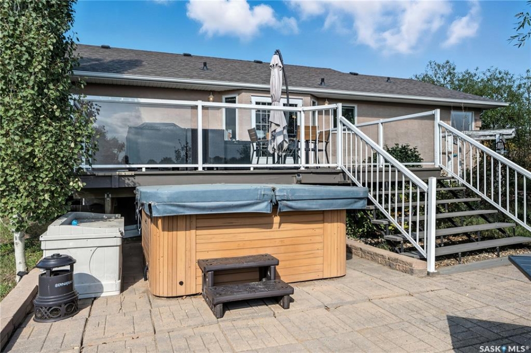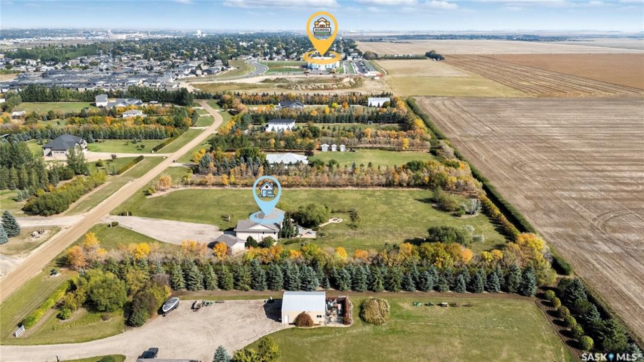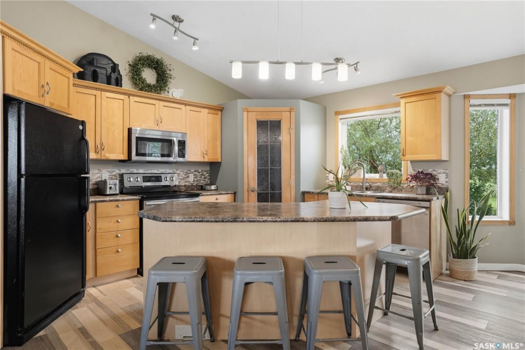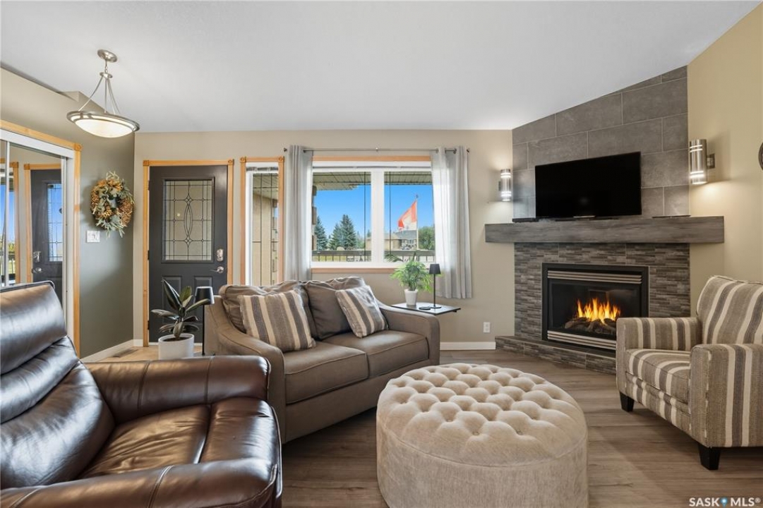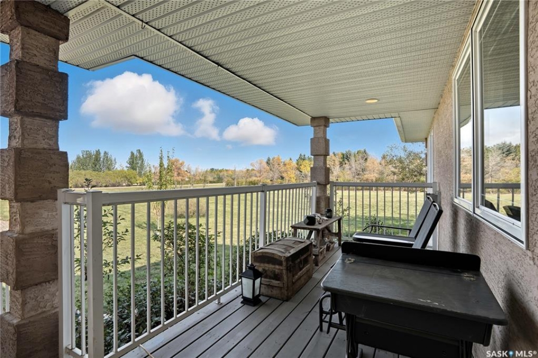 Tucked into Valley Ridge Estates and surrounded by mature trees, shrubs and natural screening! This private 2.77 acre property offers country living, while being only seconds away from Moose Jaw city limits and walking distance to the brand new Coteau Hills elementary school. Built in 2002 and lovingly maintained, this home features a comfortable main floor with an open concept kitchen/dining and living room featuring vaulted ceilings and a gas fireplace. The primary bedroom boasts a generous ensuite with a Jacuzzi tub, standalone shower and a large walk-in closet. Another full bathroom, a separate laundry room as well as an additional bedroom complete the main floor living space. The fully finished lower level is bright and airy thanks to the oversized windows found throughout. A large family room, three additional good size bedrooms and another 4 piece bath with jacuzzi tub complete the lower level. The double car attached garage plus an additional 16' x 24' detached garage provide ample storage for all of your toys and equipment. The rear of the home features a large south facing deck and a lower patio area perfect for entertaining or enjoying your hot tub(included). This home is move in ready, the only thing left to do is put your feet up and enjoy the peace and tranquility. Recent updates include shingles (2020), new furnace (2024), hot water heater (2022), new flooring in basement (2017), new flooring upstairs (2019). Property is on Municipal water.