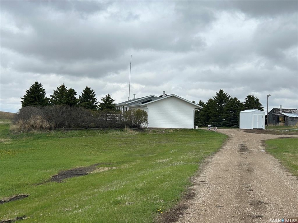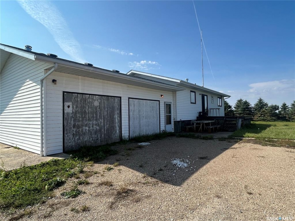 Dreaming about country life? This might be the property for you! This home was built in 1989 with a double attached garage. Situated on a 30 acre parcel south of hwy 15 in the RM of Wood Creek, this acreage offers privacy and tons of space for outdoor living, hobby farming, or just enjoying the outdoors. South facing living room shares a vaulted ceiling with the north facing kitchen/dining room. A 4 pc bathroom (recently updated) and 3 bedrooms complete the main level. Basement is partially finished with walls insulated/drywalled and concrete floors. Layout has a large family room (currently used as a bedroom), a rough in for 3 pc bath, bedroom and utility/laundry room. Double garage has gravel floor and currently houses the cistern. Heat source is an electric furnace. Sewer system pumps out to lagoon. Shingles were updated approx 2018, Exterior is vinyl siding. Outside the terrain is rolling, with tons of room for future development of a shop, second home, or whatever your heart desires. Great upside potential for a buyer with carpentry skills!
