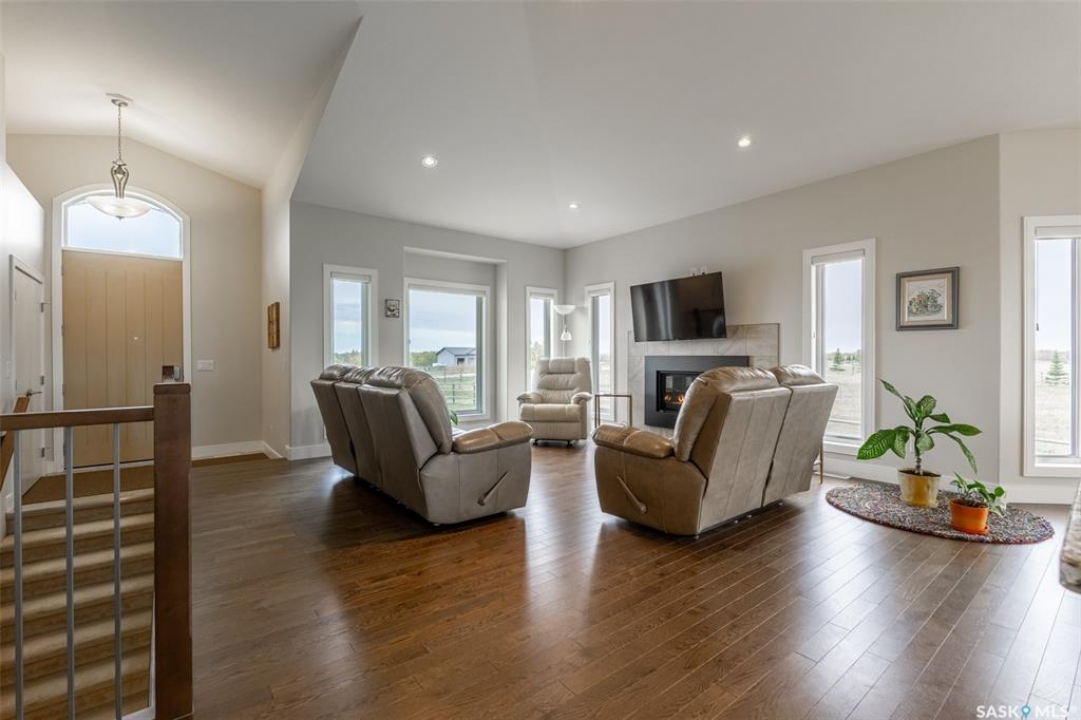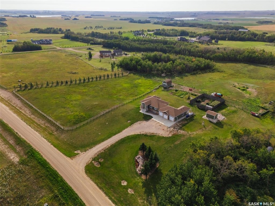 Welcome to 118 Louise Crescent in the coveted acreage community of Cherry Hills — just 15 minutes from Saskatoon's edge. This 1,502 sq. ft. executive bungalow is a stunning blend of modern design, smart functionality, and country charm. Step inside to discover a bright, open-concept main floor with an exceptional window package that floods the home with natural light. The spacious living room, dining area, and kitchen flow seamlessly under a vaulted ceiling, creating the perfect setting for entertaining or relaxing. The kitchen features quartz countertops, a corner pantry, roll-out drawers, stainless steal appliances. The dining room can easily seat a large extended family for holiday meals and the gas fireplace in the adjoining living room makes for cozy evenings. Hardwood runs throughout the main level, and a covered deck off the dining area allows for year-round BBQ. The primary suite is a lovely retreat, offering a large walk-in closet and an ensuite with a soaker tub beneath a privacy rain-glass window, heated floors, and a walk-in shower. A 2nd large bedroom (or office), another 4-piece bath, and a spacious mudroom/laundry room with built-in cabinetry, quartz countertops, and deep utility sink complete the main floor — all leading to an oversized triple-car garage with a separate workshop bay and a sunlit all-season greenhouse.The fully finished basement features a large family and games area, 2 more bedrooms, 4-piece bath, and a vented cold storage room perfect for preserves or wine. Outside, the 7.14 acre property is 3/4 fenced with treated rail fencing, hotwired, & divided into five paddocks with a 4-season watering bowl sourced by underground lines. Mature spruce trees border the property, and there's a drive-in garden shed, an adorable matching horse barn, and 2 fully developed gardens with direct waterlines. Complete with central air, central vac, and window coverings, this Cherry Hills acreage offers comfort with country serenity — a truly rare find.