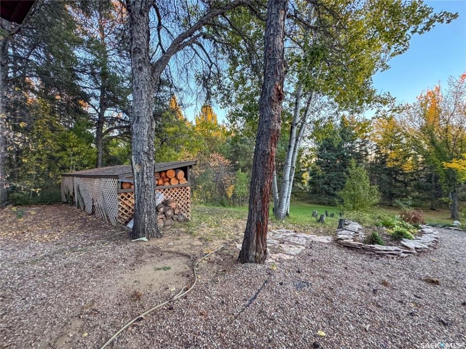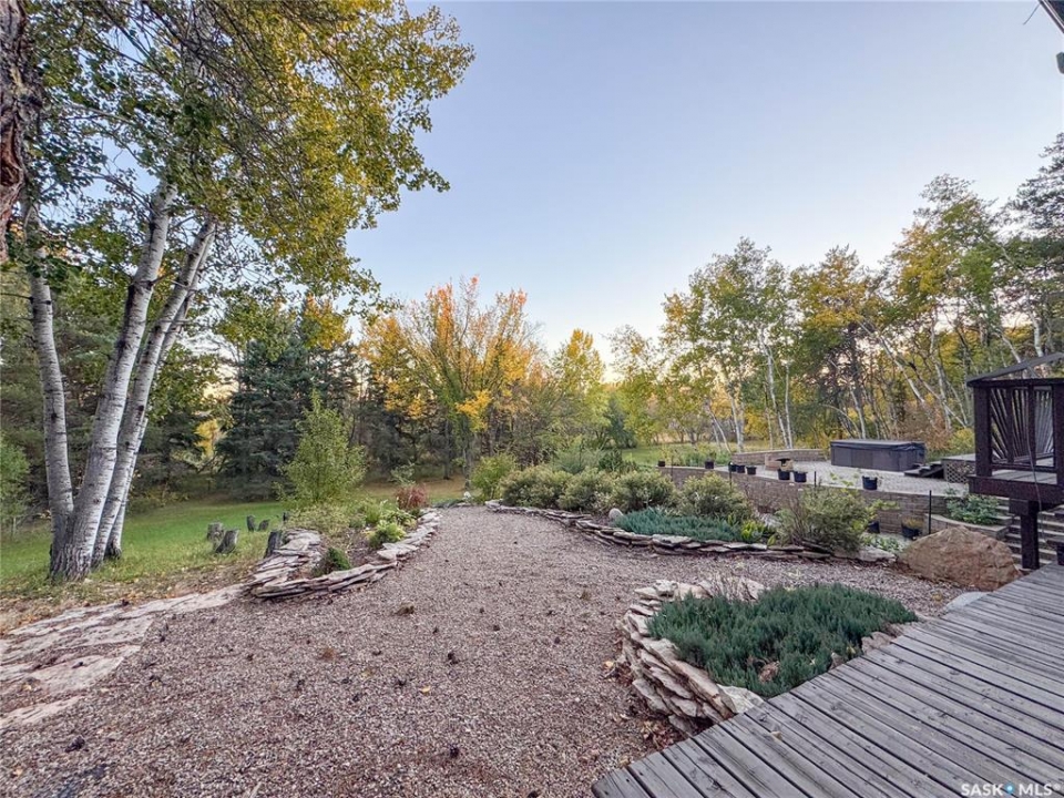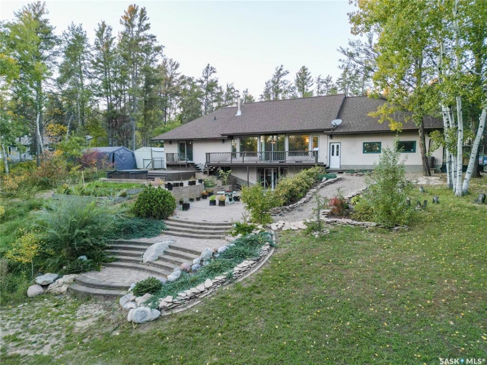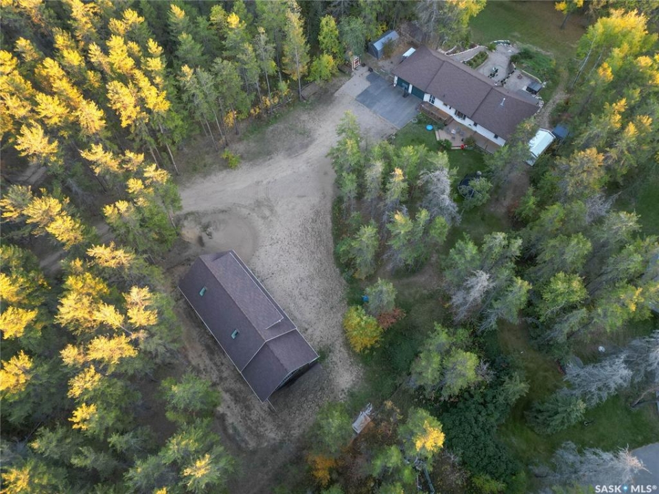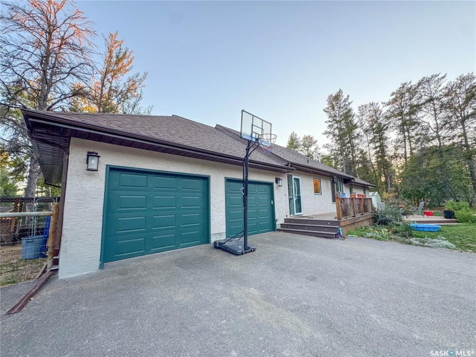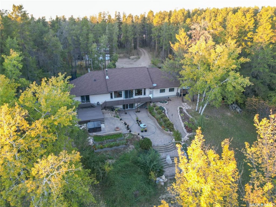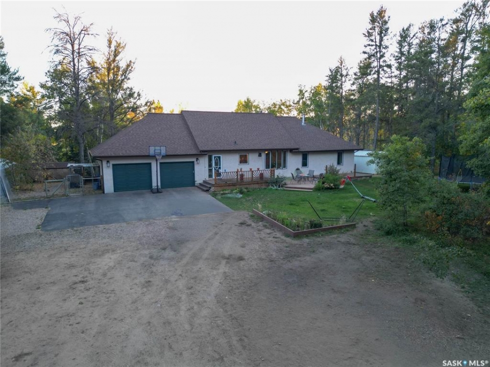 Immaculate 4 Bedroom + Den Acreage with Walkout Basement & Dream Garages only 5 Minutes from Prince Albert! This stunning and meticulously maintained 1,518 sq/ft bungalow offers the perfect blend of luxury, privacy, and convenience on a beautifully landscaped 2.47-acre lot. Built in 1994, this home features a spacious walkout basement, attached 26' x 28' double attached garage, and an incredible 24' x 48' heated detached triple garage complete with a carport and fully finished loft space above — ideal for hobbies, storage, or a home business. The main floor welcomes you with vaulted ceilings, hardwood flooring, and a cozy wood-burning fireplace with stone surround and built-ins in the bright south-facing living room. The kitchen offers an abundance of cabinetry and opens to the dining area. Three spacious bedrooms, a full bathroom, and a private ensuite in the primary which also has access to the deck and hot tub overlooking the breathtaking yard. The walkout basement is an entertainer's dream with a massive games room and family room featuring built-ins, cork flooring, and access to the covered patio. You'll also find a fourth bedroom, den, full bathroom, laundry, and plenty of storage space. Outside, the fully fenced and heavily treed property provides complete seclusion with green space, and manicured landscaping that must be seen to be appreciated. Additional features include central air conditioning, central vac, multiple sheds, and pavement right to your driveway. A one-of-a-kind property offering the best of acreage living with city convenience — truly impressive inside and out!