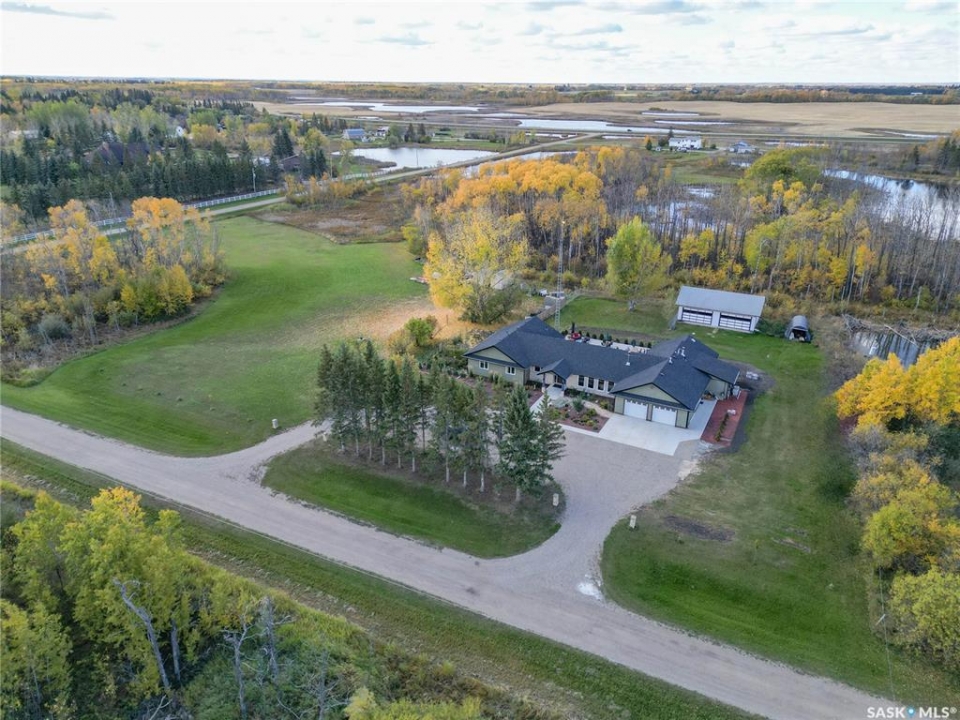 Once in a lifetime 10 acre estate in prestigious Madden Place neighborhood of Green Acres – fully updated & turn key! This extraordinary 3,466 sq/ft ranch-style bungalow offers unmatched luxury, privacy, and convenience just minutes from Prince Albert. Set on 10 beautifully landscaped acres with an additional 75 trees planted, this sprawling estate is truly one of a kind. Impeccably maintained and move-in ready, the home features 4 bedrooms plus a den, 4 bathrooms, and over 3,400 sq/ft of refined living space. The stunning great room showcases vaulted ceilings with exposed wood beams, wood burning fireplace, hardwood floors, and expansive windows that flood the space with natural light. The open-concept kitchen boasts two-tone cabinetry, granite countertops, a massive island, stainless steel appliances, and a butler's pantry. A second family room with cozy N/G fireplace and wet bar leads to an incredible sunroom with vaulted wood-beamed ceilings, wood burning fireplace, and wall-to-wall windows overlooking the grounds. The spacious primary suite offers a N/G fireplace, deck access with a gazebo, and luxurious 5-piece ensuite with full Travertine slabs in the shower and Travertine dual sinks. The home also includes a large laundry room with abundant storage and an inviting foyer with custom barn doors. Outdoor living is unmatched — enjoy an expansive patio done with paving stones, meticulous landscaping, fenced areas, and unmatched curb appeal. The property includes both an attached heated 26' x 28' double garage and a detached garage with two double doors and concrete floors. Additional highlights: city water, two natural gas fireplaces, two air conditioning units, newer vinyl windows, new 200-amp panel, central vac, electric hot water heater, weeping tile, fire-kill granite front step, and four fireplaces in total. A rare opportunity to own a truly perfection level estate — offering luxurious one-level living in one of Prince Albert's most sought-after locations.
