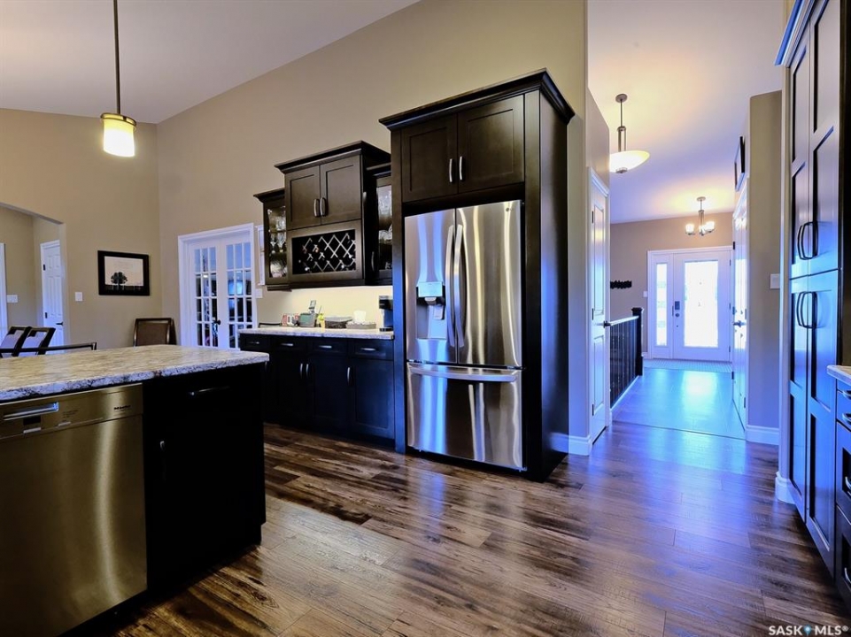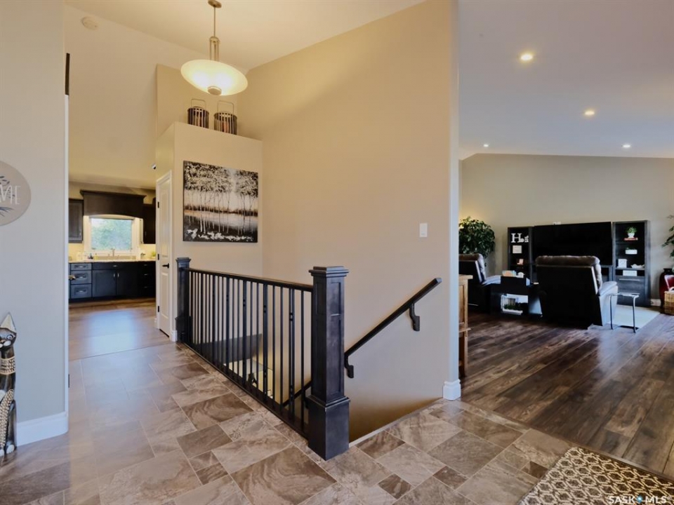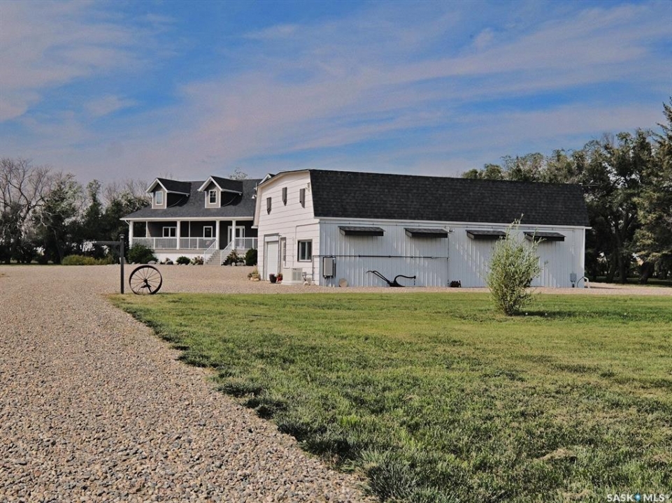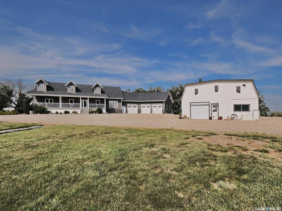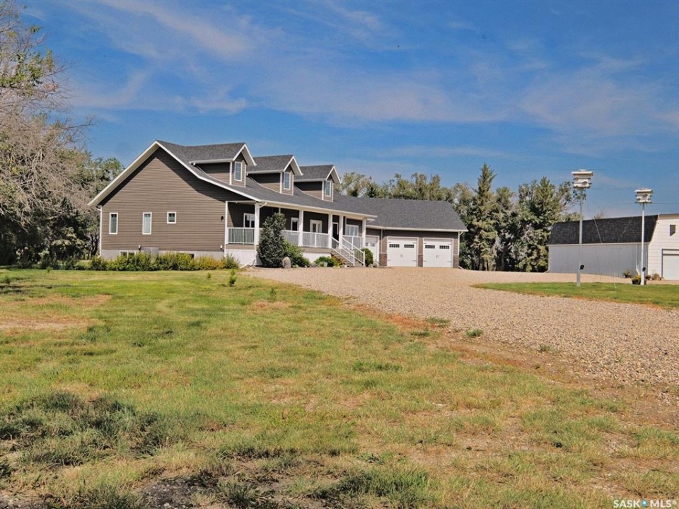 This stunning 2,298 sq. ft. executive bungalow, built in 2015, offers exceptional quality, modern comfort, and country living at its finest. Designed with attention to detail and built to impress, this home combines luxury finishes with practical features, all set on a beautifully developed 14-acre property, located directly across the road of the west side of town limits. Inside, the home features an open and inviting layout with two spacious bedrooms and an optional third, along with a main floor office/bedroom and laundry/bedroom for ultimate convenience. There are 3.5 bathrooms, including a luxurious 5-piece ensuite off the primary bedroom complete with double sinks, a soaker tub, and separate shower. The fully developed basement, built with 9-foot ICF walls, provides generous living space ideal for family recreation or entertaining. The attached 1,398 sq. ft. heated garage is fully finished, offering ample room for vehicles, hobbies, or storage. Outside, the property is equally impressive — a fully fenced 14-acre yard with a keypad remote entry gate ensures both privacy and security. The yard is beautifully landscaped with approximately 1,200 planted trees, all supported by a drip irrigation system. A Generac generator provides full-yard backup power, adding peace of mind in any situation. Additional features include central air, central vacuum, a hot tub, and several outbuildings — including a 60x100 canvas-covered storage building, a quonset, and a shop — providing incredible versatility for work, storage, or recreation. This property is truly in like-new condition and showcases pride of ownership throughout. With its exceptional craftsmanship, thoughtful layout, and impressive amenities, it offers the best of both luxury and practicality — a rare opportunity for those seeking an executive home with space to live, work, and play. Buyers now have the option of buying the quarter section the acreage is located on! See MLS SK026532