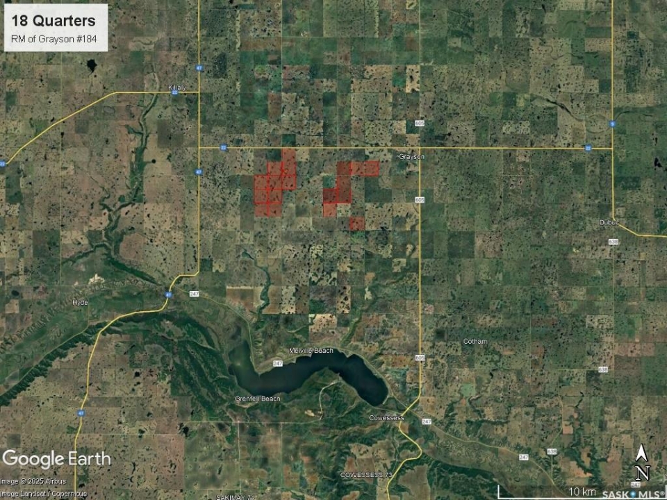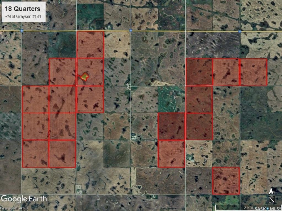 Incredible opportunity to acquire 18 quarters of productive farmland with a well-developed yard site near Grayson, SK. This land offers a strong soil base rated G and H by SCIC, ideal for cereal grains, oilseeds & pulse crop production. The property features well-configured blocks for streamlined operations. SAMA field sheets report 2,474 cultivated acres with a Final Rating Weighted Average of 56.17. Access is excellent, with gravel primary grid roads and some frontage on Highway 22. The established yard site includes a 1,930 sq ft bungalow with 4 bedrooms, 3 baths, a finished basement, and an attached heated double garage. Yard site features: 160x60 Machinery Storage Building (bi-fold & sliding doors, power, dirt floor), 38x44 Heated Shop (insulated, concrete floor, power, 18x14 overhead door, outside hydrant), 80x40 Arch Rib Quonset (power, dirt floor), 24x16 Metal Clad Storage Shed (power, concrete floor), 26x21 1-Car Garage (insulated, concrete floor, power), 40x15 Wood/Stone Storage Building (concrete floor), 40x30 Hip Roof Barn (power, hydrant nearby), 28x18 Animal Shelter (metal roof), approx. 2.5 acres fenced for grazing with good wood fencing & Henn-Rich watering bowl and underground power to buildings. Located minutes from Grayson and close to major agricultural hubs of Yorkton and Melville, this property offers convenient access to grain delivery points, farm implement dealerships, and essential services. This package is an excellent addition to an existing farm, a strong start for someone relocating to the area, or a strategic investment in Saskatchewan's thriving agricultural market.
