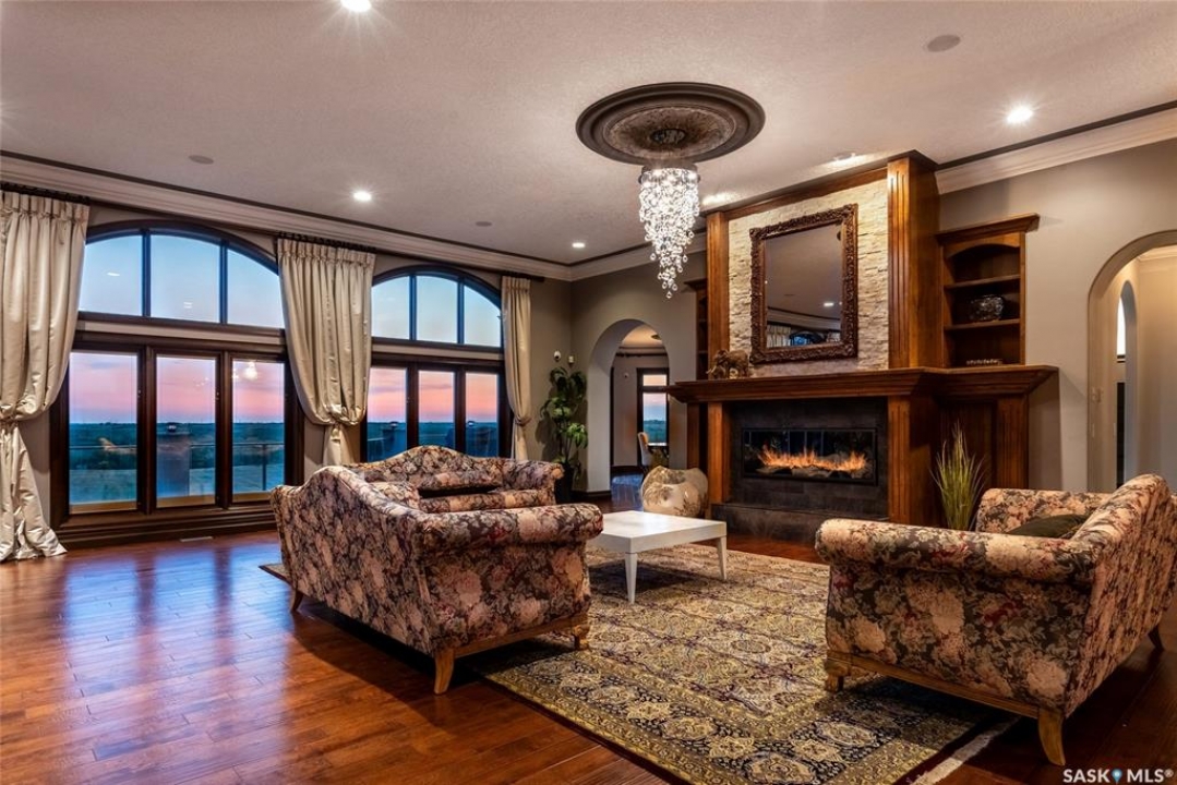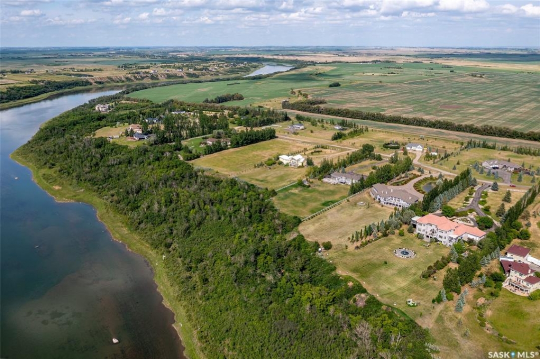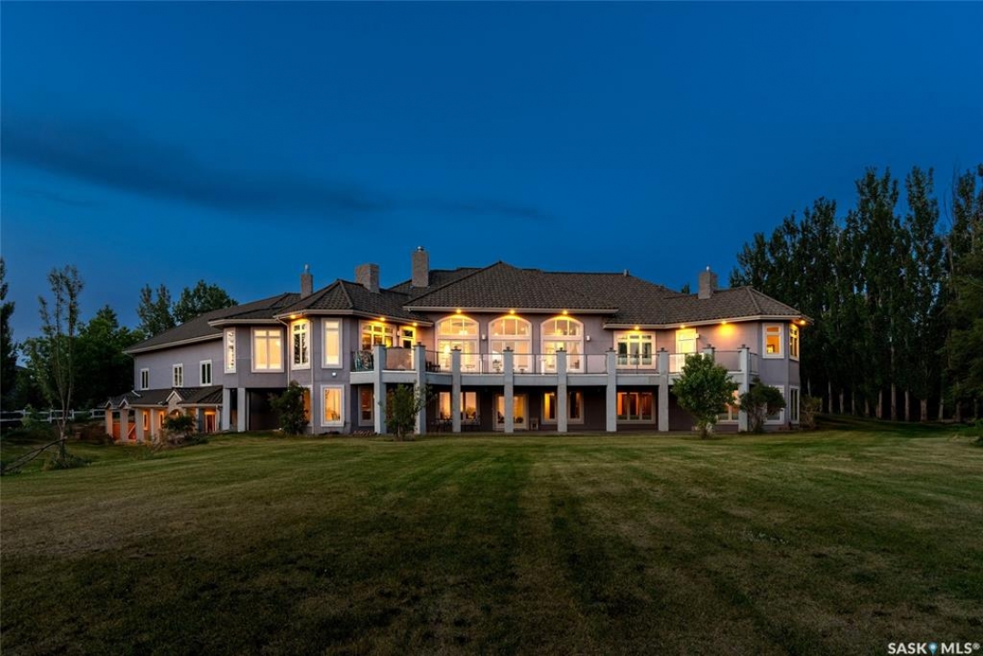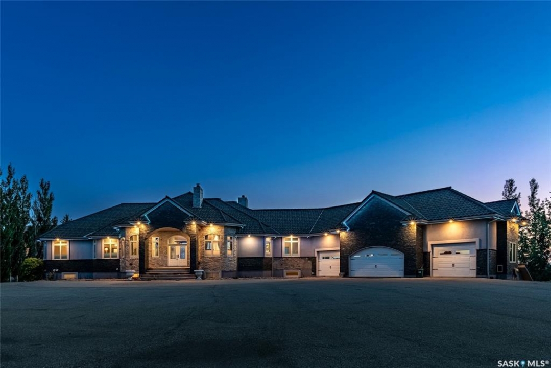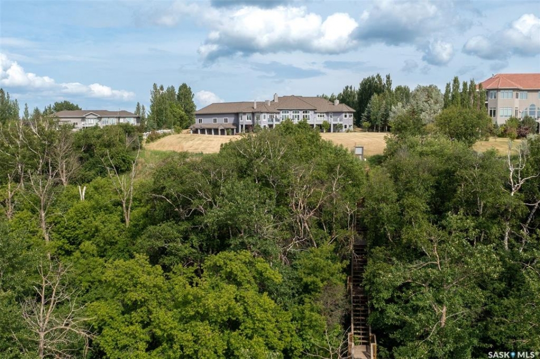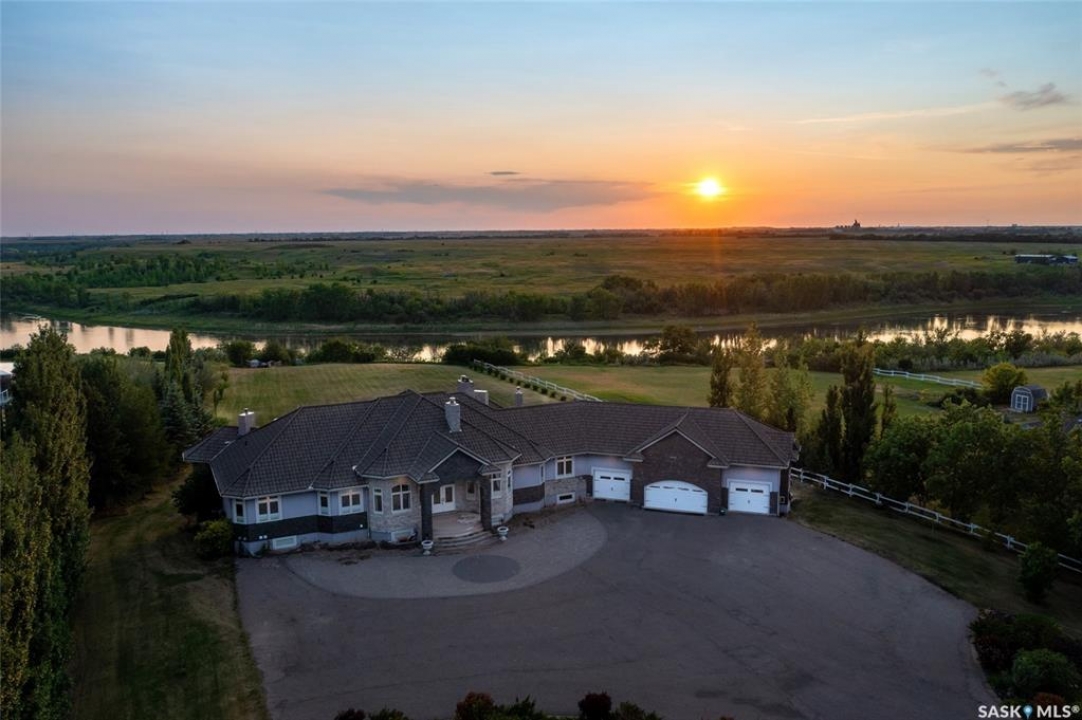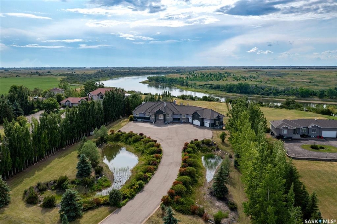 Welcome to one of Saskatoon's most prestigious estates. Located in the hamlet of Rivers Edge, this property is a mere 16 minute drive from the University of Saskatchewan. Perched atop the plateau of Rivers Edge the views from the home are breathtaking with access to the South Saskatchewan River below. Featured here is a 4406 square foot walkout bungalow that features 5 bedrooms, 5 bathrooms, in addition to a gorgeous nanny-suite which is designed to extend ownership longevity. As you walk through the main doors to the home you are greeted by a grand foyer which introduces you to the great room with 12' ceilings. Features that proliferate the home are solid wood cabinetry, casings, baseboards, jambs, doors, and millwork in addition to 6 gas-fireplaces. The walkout is complete with a beautiful wet bar, remarkable theatre room, and custom exercise area with steam shower. Outside you will find a sweeping 830 square foot deck that spans nearly the entire width of the home, complemented by over $250,000 of custom landscaping and road work. This property is truly extraordinary in every sense.