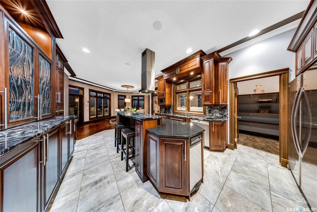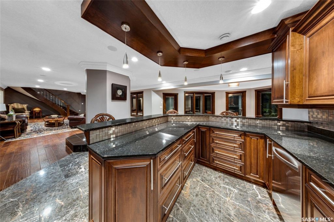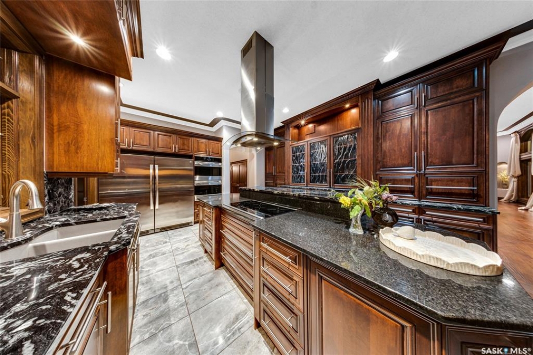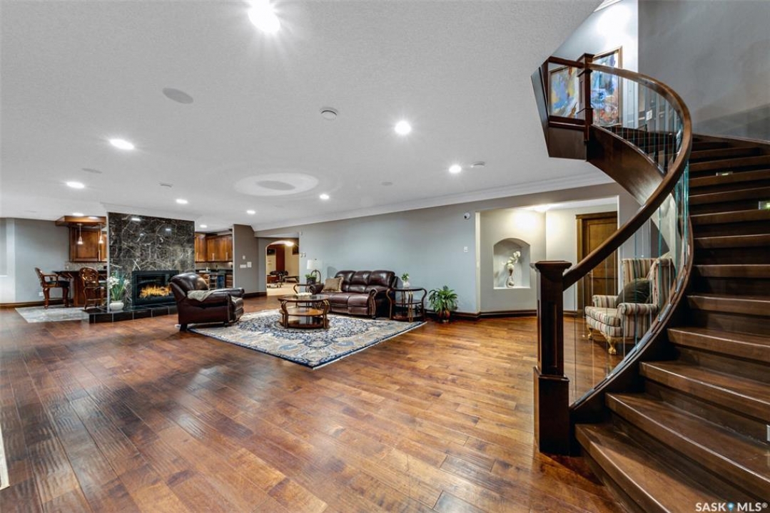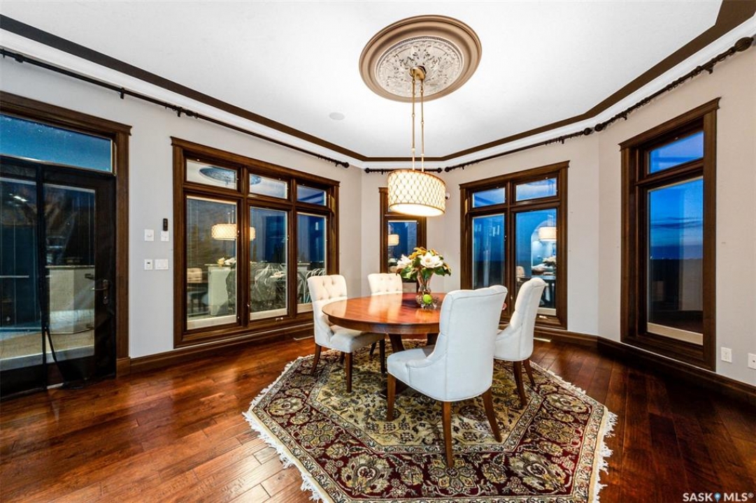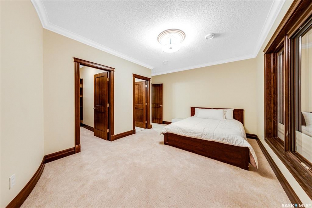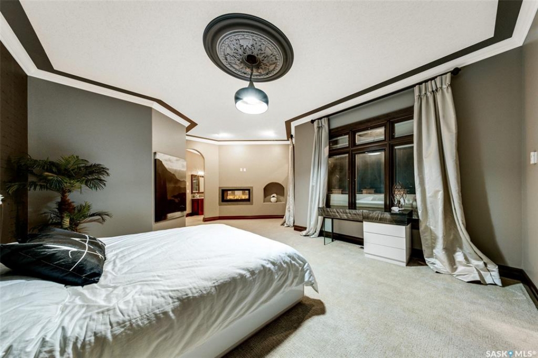 Welcome to one of Saskatoon's most prestigious estates. Located in the hamlet of Rivers Edge, this property is a mere 16 minute drive from the University of Saskatchewan. Perched atop the plateau of Rivers Edge the views from the home are breathtaking with access to the South Saskatchewan River below. Featured here is a 4406 square foot walkout bungalow that features 5 bedrooms, 5 bathrooms, in addition to a gorgeous nanny-suite which is designed to extend ownership longevity. As you walk through the main doors to the home you are greeted by a grand foyer which introduces you to the great room with 12' ceilings. Features that proliferate the home are solid wood cabinetry, casings, baseboards, jambs, doors, and millwork in addition to 6 gas-fireplaces. The walkout is complete with a beautiful wet bar, remarkable theatre room, and custom exercise area with steam shower. Outside you will find a sweeping 830 square foot deck that spans nearly the entire width of the home, complemented by over $250,000 of custom landscaping and road work. This property is truly extraordinary in every sense.