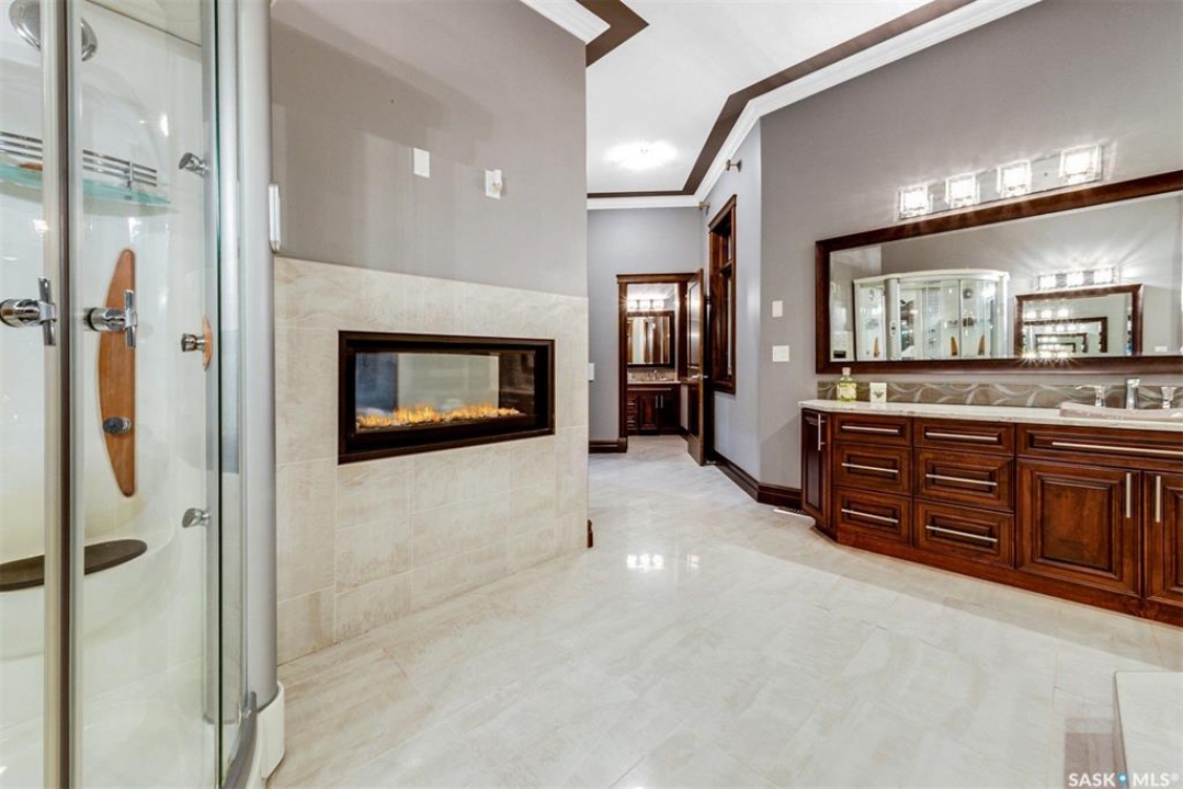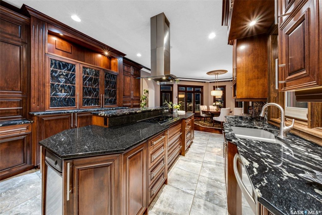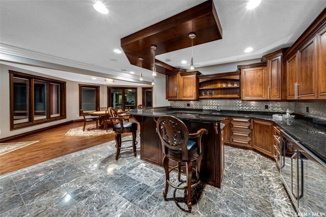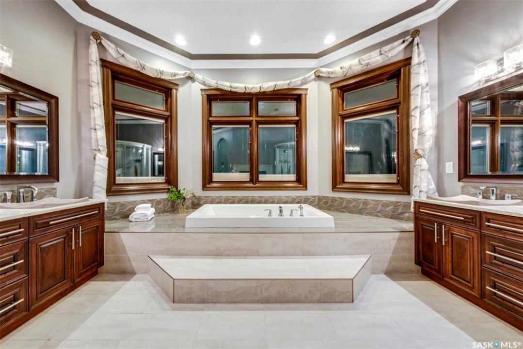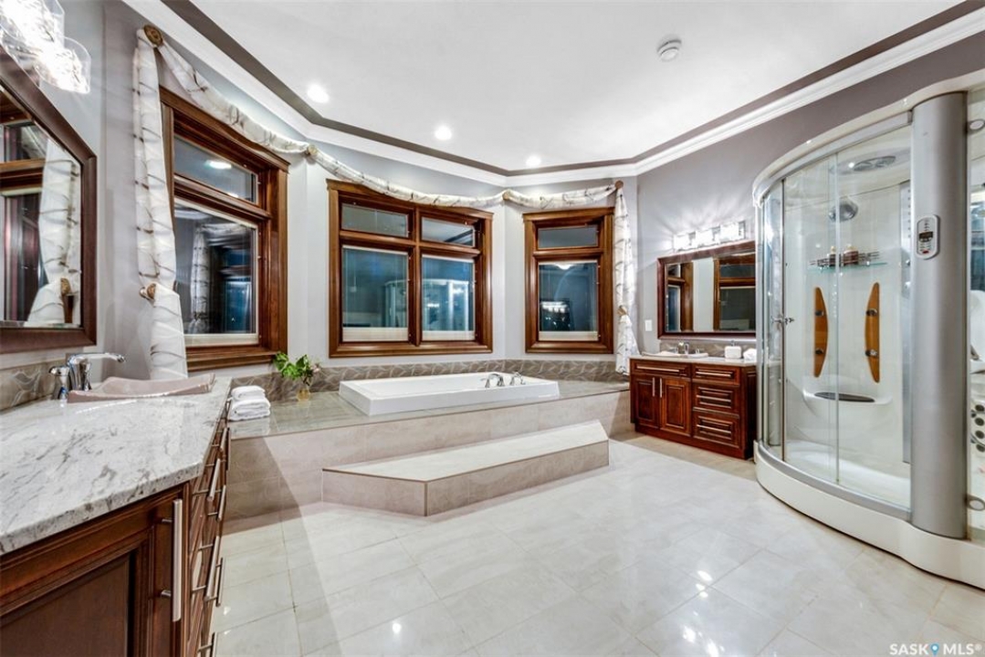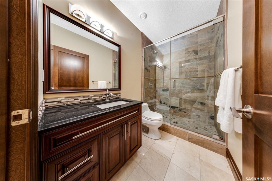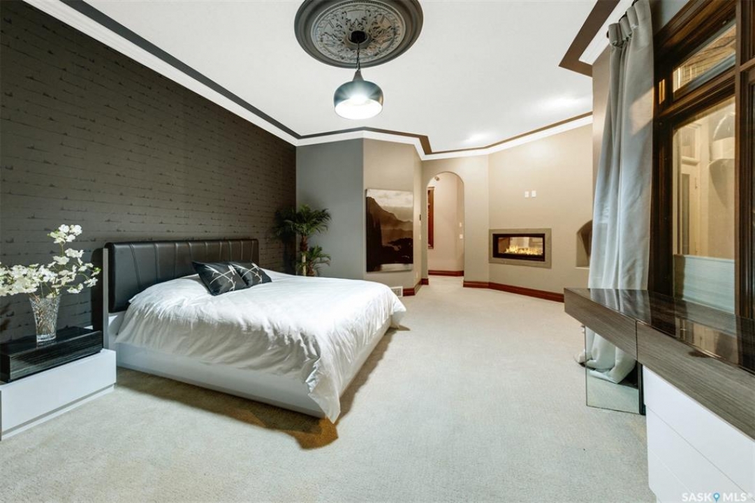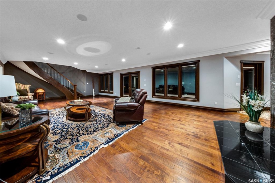 Welcome to one of Saskatoon's most prestigious estates. Located in the hamlet of Rivers Edge, this property is a mere 16 minute drive from the University of Saskatchewan. Perched atop the plateau of Rivers Edge the views from the home are breathtaking with access to the South Saskatchewan River below. Featured here is a 4406 square foot walkout bungalow that features 5 bedrooms, 5 bathrooms, in addition to a gorgeous nanny-suite which is designed to extend ownership longevity. As you walk through the main doors to the home you are greeted by a grand foyer which introduces you to the great room with 12' ceilings. Features that proliferate the home are solid wood cabinetry, casings, baseboards, jambs, doors, and millwork in addition to 6 gas-fireplaces. The walkout is complete with a beautiful wet bar, remarkable theatre room, and custom exercise area with steam shower. Outside you will find a sweeping 830 square foot deck that spans nearly the entire width of the home, complemented by over $250,000 of custom landscaping and road work. This property is truly extraordinary in every sense.