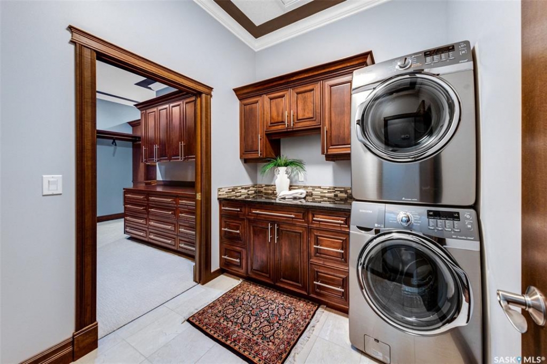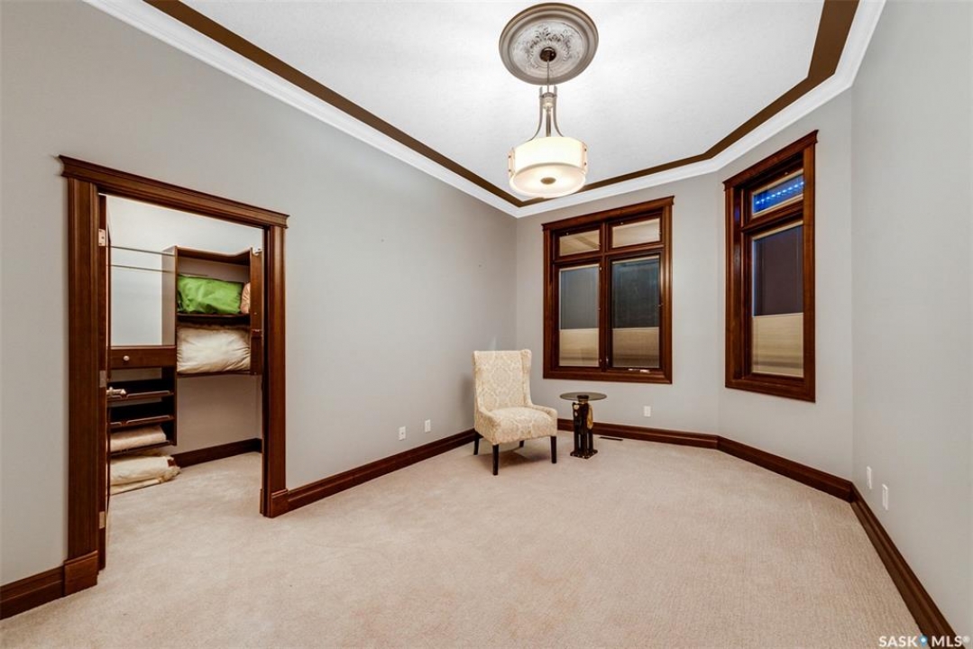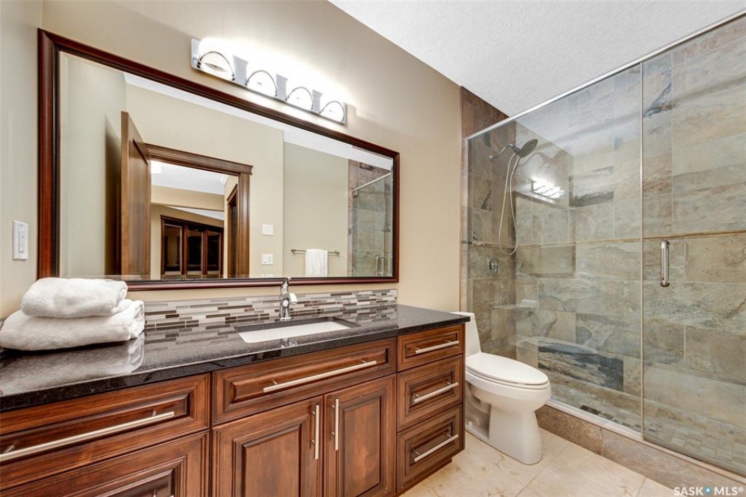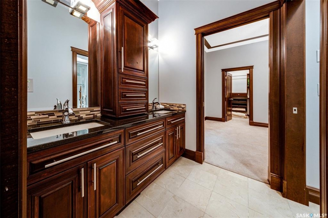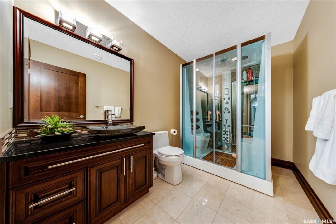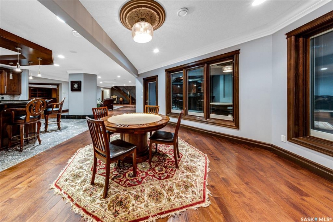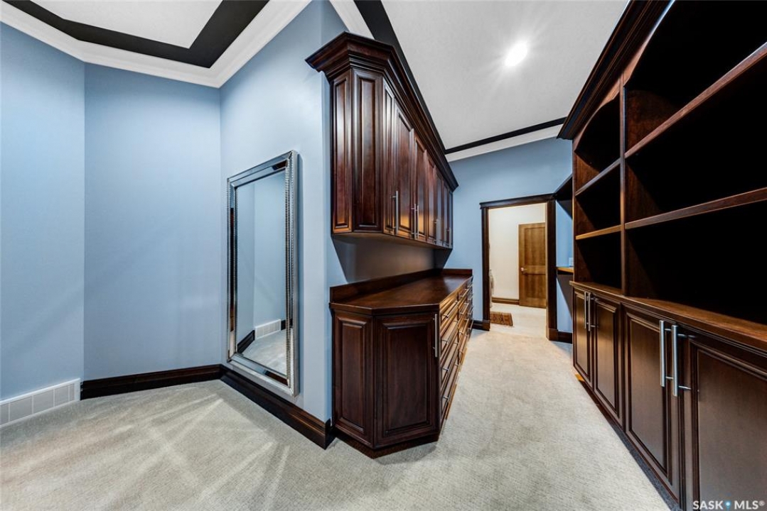 Welcome to one of Saskatoon's most prestigious estates. Located in the hamlet of Rivers Edge, this property is a mere 16 minute drive from the University of Saskatchewan. Perched atop the plateau of Rivers Edge the views from the home are breathtaking with access to the South Saskatchewan River below. Featured here is a 4406 square foot walkout bungalow that features 5 bedrooms, 5 bathrooms, in addition to a gorgeous nanny-suite which is designed to extend ownership longevity. As you walk through the main doors to the home you are greeted by a grand foyer which introduces you to the great room with 12' ceilings. Features that proliferate the home are solid wood cabinetry, casings, baseboards, jambs, doors, and millwork in addition to 6 gas-fireplaces. The walkout is complete with a beautiful wet bar, remarkable theatre room, and custom exercise area with steam shower. Outside you will find a sweeping 830 square foot deck that spans nearly the entire width of the home, complemented by over $250,000 of custom landscaping and road work. This property is truly extraordinary in every sense.