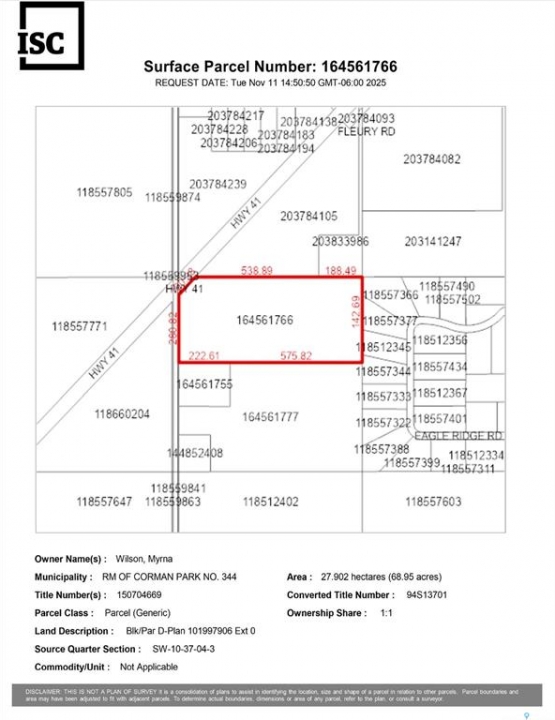 Prime 69-Acre Opportunity – Just 5 Minutes East of Saskatoon!? Discover this spectacular 69-acre parcel perfectly located at the corner of Highway 41 and Lewelyn Road, backing onto the sought-after Eagle Ridge Estates. This property offers the ideal blend of rural tranquility and city convenience.? All major utilities are close by, including city water, natural gas, and power, making future development a seamless possibility. Currently seeded with barley, the land is well-maintained and versatile—perfect for agricultural use, investment, or future residential expansion. Positioned adjacent to Phase II of the proposed Saskatchewan Freeway (formerly the Perimeter Highway), this property is poised for exceptional long-term value and growth. Don't miss this rare opportunity to own premium land in one of the most desirable areas just outside Saskatoon!