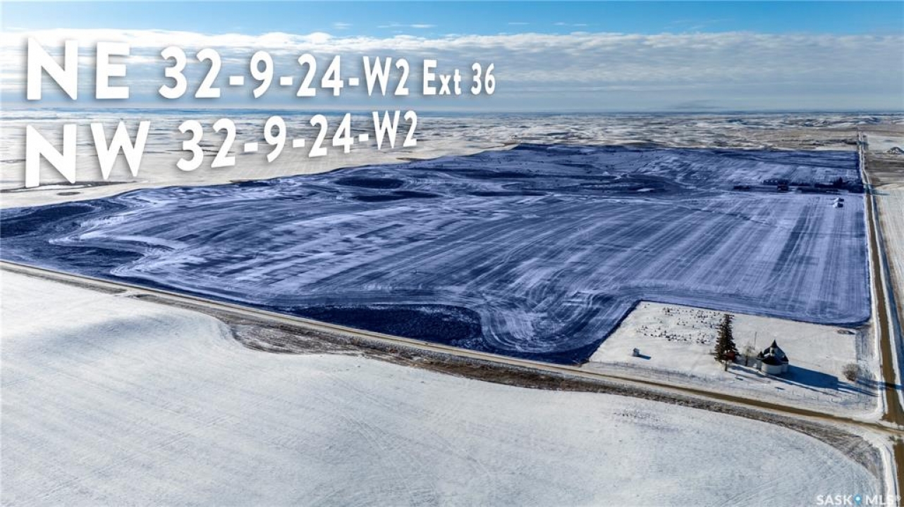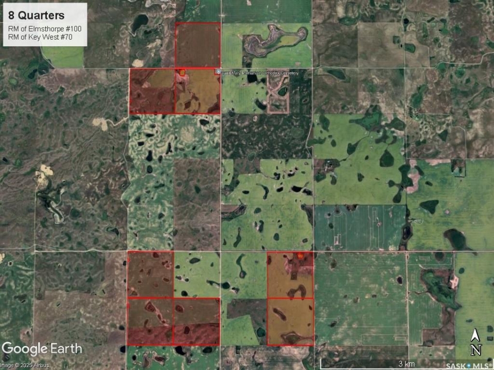 8 Quarters of productive farmland with some pasture in the Kayville/Dahinda, SK area located in the R.M. 's of Key West #70 and Elmsthorpe #100. Owner states 935 cultivated acres, 40 acres tame hay, with the balance of the usable land in native grass. SCIC soil classifications consist of 4 “H”, 3 “J” and 1 “K”. This land has great access with municipal roads to all of the blocks of land. The crop land is leased out for the 2026 crop season providing a 3.2% return of the asking price. There is no lease in place on the tame hay and pasture land and could provide additional revenue if was leased out. The main yard site on the NE 32-9-24 W2 has power to the yard, a steel quonset, six bins total (4 hopper and 2 flat bottom), a bungalow (has not been lived in for several years), and several other outbuildings. There is a second yard site area with an older house and outbuildings with power to the yard on the NE 21-9-24 W2. Asking Price Breakdown: $2,515.10/Titled Acre. Outlines are an approximation.
