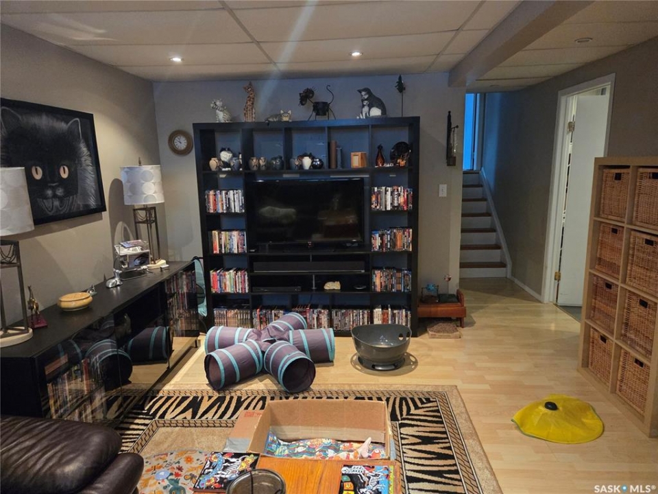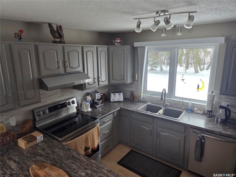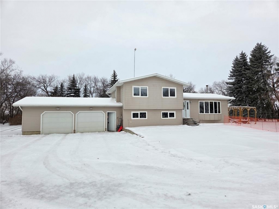 Welcome to the perfect acreage to fit anyone's needs. 5 bedrooms, 2 bathrooms, 3 living areas and plenty of storage on this 4 level split just a short 8kms from the heart of Tisdale. 3.72 acres enclosed with in a complete shelterbelt with a large storage shed, 20x30x12 tarp shed, garden area and tree house for the little ones. Large deck with covered gazebo off the back entrance, year round fish pond with fish along the patio entrance to garage, enclosed CATIO for the cats with separate house entrance and a 2 car 30x24 attached garage with built in cabinets and electric plug in heater. All appliance except bar fridge and basement freezer included (stove and hood fan new) as will the couches and electric fireplace in the basement, bed in first upper bedroom, lawn sweep and garden tiller. Sewer is by septic tank with pump out to south east, water is rural pipeline, 200 amp panel box. Sump pump pumps out far behind garage. Many many upgrades in the past years make this home ready to move in and live the life.