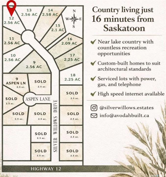 Looking for an acreage community with a close commute to the city? Welcome to Silver Willows Estates, a picturesque country living only 16 minutes from Saskatoon with architectural controls. Create your ideal lifestyle with plenty of space to build your dream home and have the acreage-style living room that you have always wanted. Imagine... Bonfires, open skies, and all things country life for you and your family to enjoy. Lake country is north on pavement, or city life is just a short drive away. K-12 schools are close by with small classroom sizes. This community-style development features 7 lots all 2.5 acres each. Silver Willows offers the lots fully serviced with power, gas, and phone to the property. Highspeed internet is available and many home owners have dug wells. The sky is the limit! Homes built to suit or build your own to our architectural standards. Create a space unique to you, that promotes individuality for a beautiful community. You can be living in the country, next to a paved road and just minutes from Saskatoon's downtown and its northern work hub. Fall in love with a community-style development, neighbors that gather, all while still having your own unique space. Contact me today to find out more about this great development or hear about build options available. Builder willing to build to suit as an option. Acreage living can be yours for less than you pay for a new lot in the city.