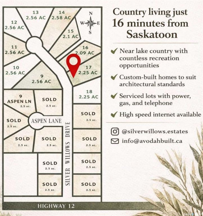 Looking for an acreage community with a short commute to the city? Welcome to Silver Willows Estates, a picturesque country living development just 16 minutes from Saskatoon, currently offering Phase 3, with Phase 1 complete and Phase 2 nearly completed, and architectural controls in place to ensure a beautiful, cohesive community. This community-style development features 7 fully serviced 2.5-acre lots with power, gas, and phone to the property, high-speed internet available, and many homeowners choosing to dig private wells. Build your dream home or choose a build-to-suit option, all within architectural standards that promote individuality while maintaining a stunning neighborhood feel. Enjoy open skies, bonfires, and true country living along a paved road, with lake country just north on pavement, city amenities minutes away, and K–12 schools nearby with smaller class sizes. Experience the best of both worlds. Acreage living for less than the cost of a new city lot, with space, privacy, and a strong sense of community just minutes from Saskatoon's downtown and northern work hub.