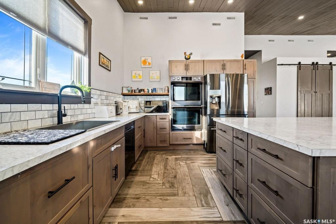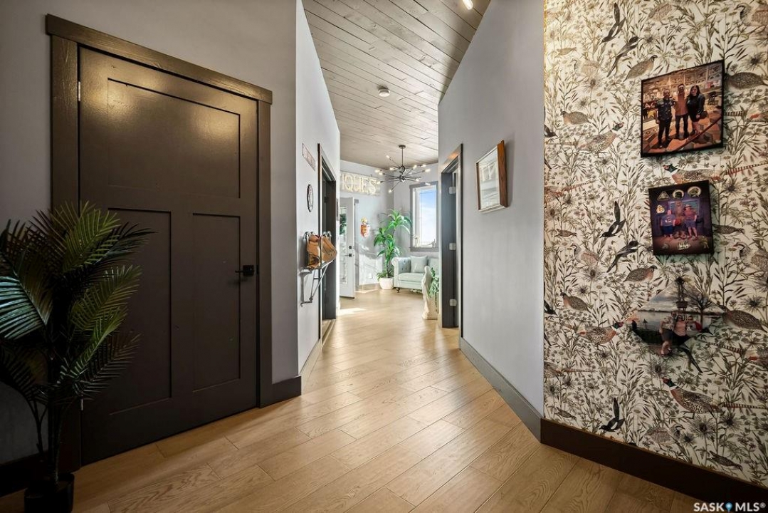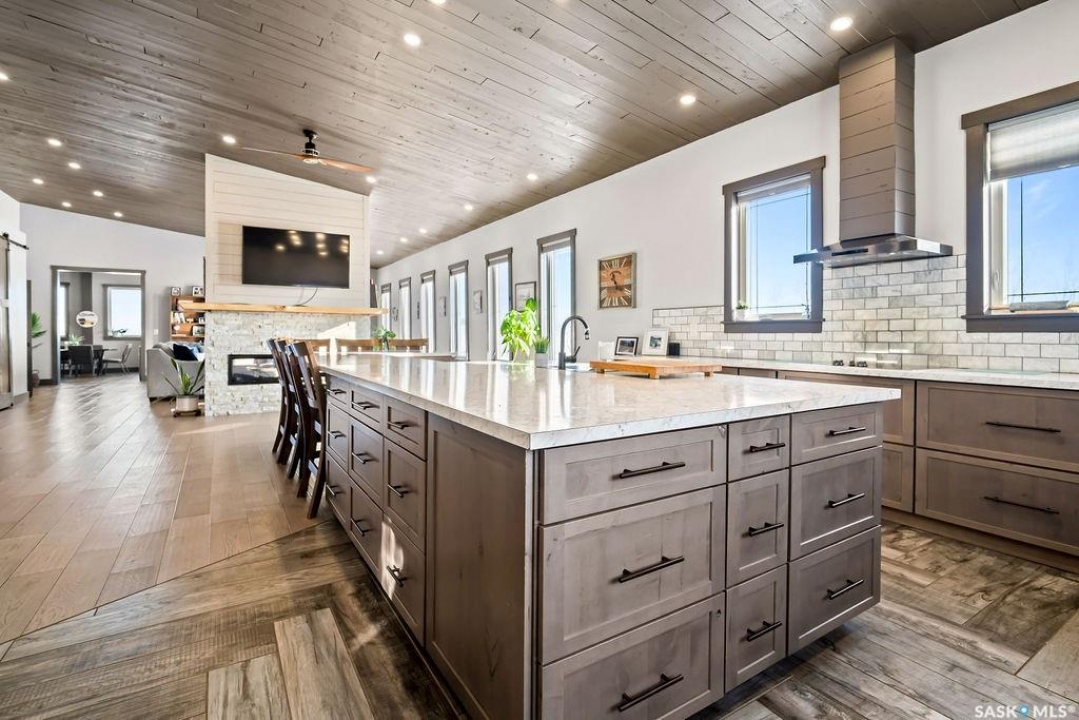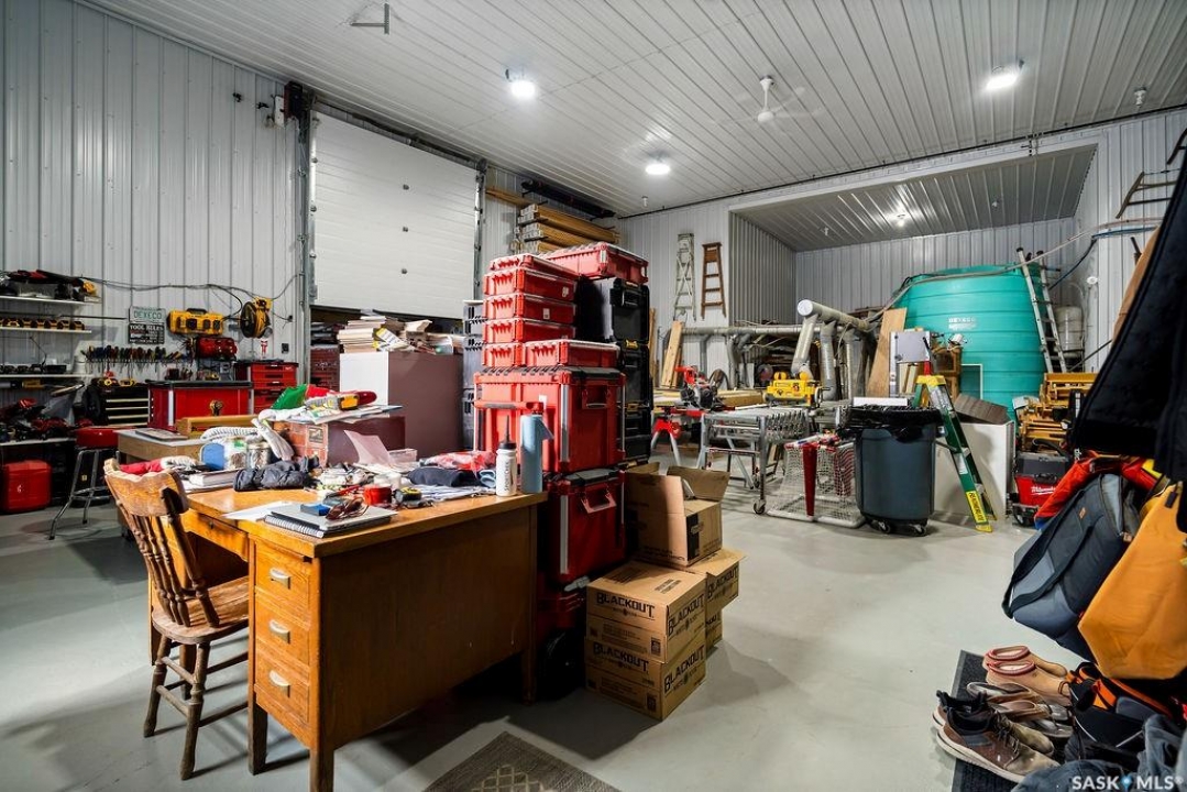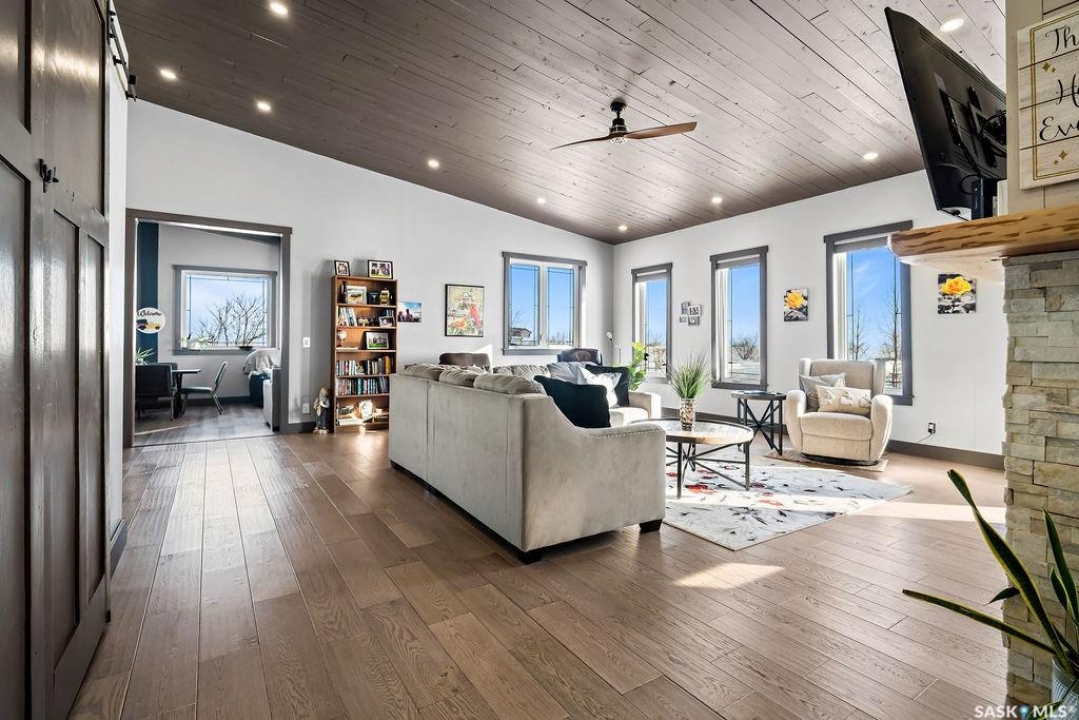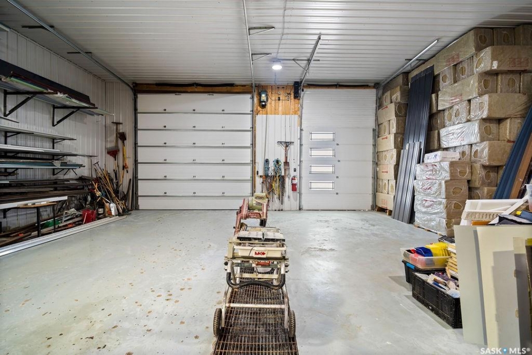 One-of-a-kind acreage located just 15 minutes from Estevan and 10 minutes from Lampman, offering exceptional space, versatility, and lifestyle potential on a beautifully maintained 5.10-acre parcel in the RM of Benson No. 35. This impressive 2016-built bungalow offers approximately 5,400 sq. ft. of thoughtfully designed living space and features two separate living quarters, ideal for multi-generational families or guest accommodation. The home includes 6 bedrooms, 4 bathrooms (an addtional bathroom in the shop), multiple living areas, and dedicated office space, with both primary bedrooms showcasing full en suite bathrooms finished with tiled flooring and tiled tub and shower surrounds. Quality interior finishes include engineered hardwood throughout the main living areas, tile in kitchens and bathrooms, custom wood moldings, and stylish lighting, while high vaulted ceilings and large windows flood the home with natural light. Each living room features a fireplace, including a striking double-sided fireplace shared with a massive chef's kitchen designed for everyday living and entertaining. Additional spaces include a bright bar and games room surrounded by windows and a closed-in hot tub room overlooking the landscaped yard. Comfort features include in-floor heat, central air conditioning, and air exchange. The attached heated 5,500 sq. ft. shop is divided into three bays with overhead door access, offering excellent flexibility for personal or commercial use. The bay connected to the home includes an additional bathroom, laundry hookups, and a commercial-grade exhaust fan. The yard is fully manicured with multiple sprinkler zones supplied by the well and programmable from your phone. A detached outbuilding with concrete floor and tin siding, currently used as a chicken coop, adds further versatility. Zoned AG/RES/COMM, this rare acreage offers outstanding residential comfort with exceptional shop space close to both communities.