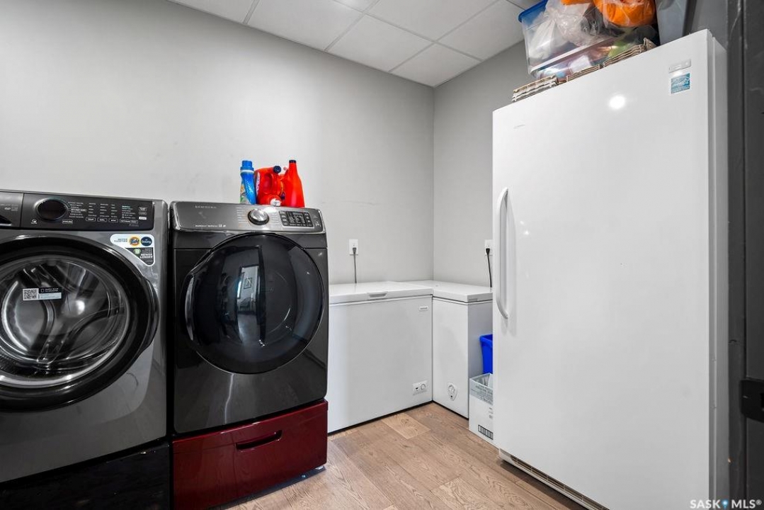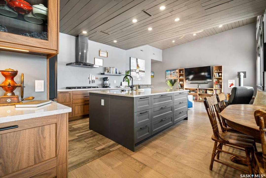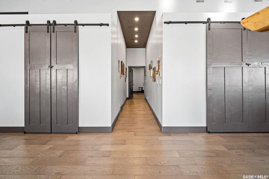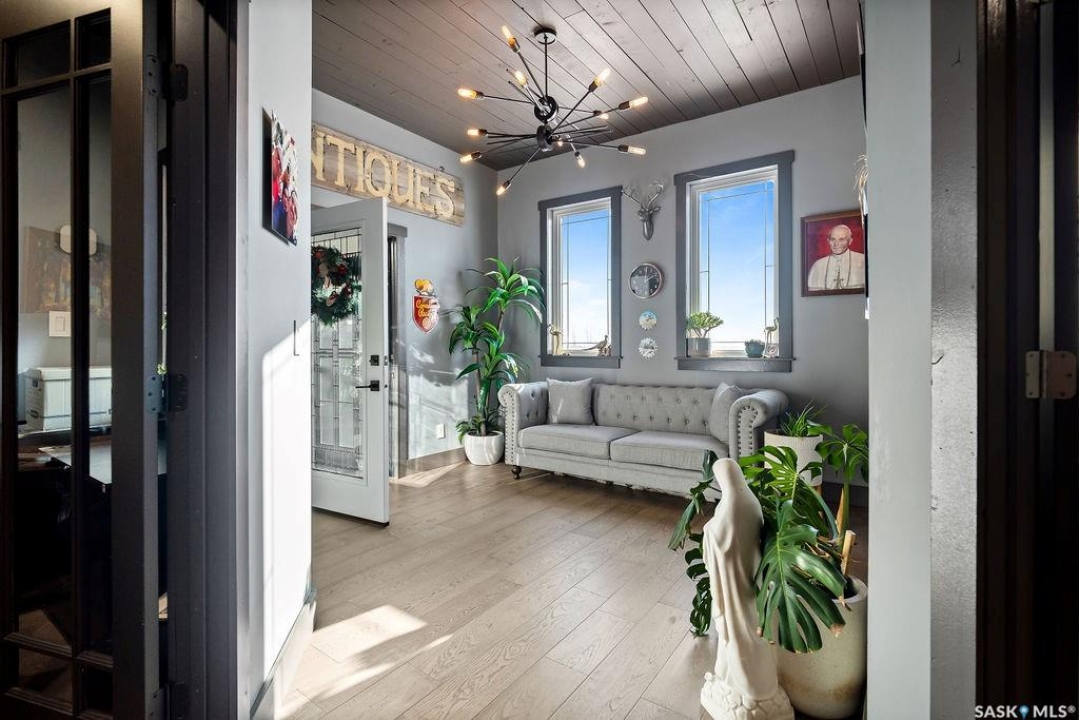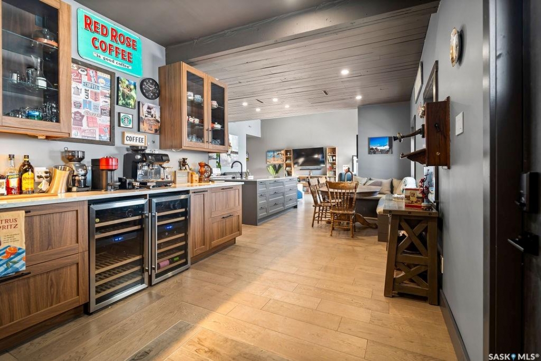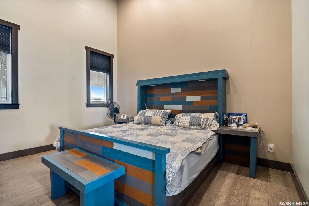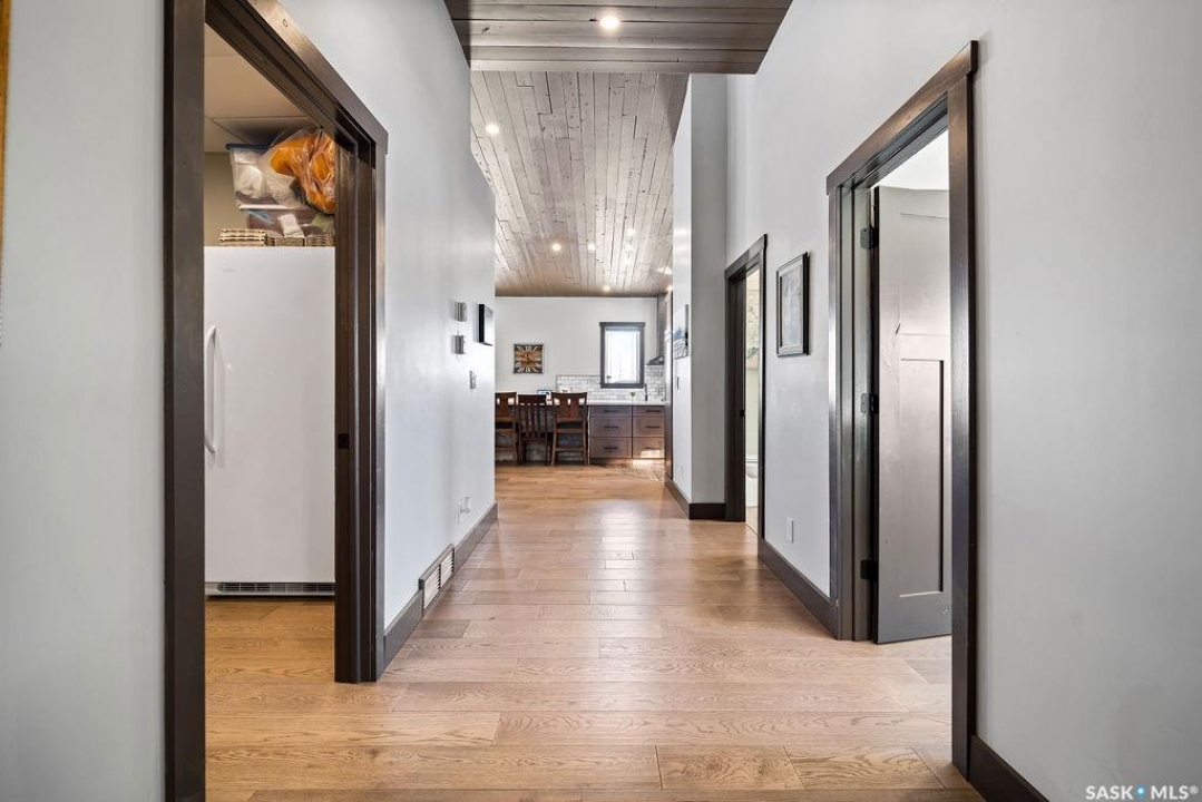 One-of-a-kind acreage located just 15 minutes from Estevan and 10 minutes from Lampman, offering exceptional space, versatility, and lifestyle potential on a beautifully maintained 5.10-acre parcel in the RM of Benson No. 35. This impressive 2016-built bungalow offers approximately 5,400 sq. ft. of thoughtfully designed living space and features two separate living quarters, ideal for multi-generational families or guest accommodation. The home includes 6 bedrooms, 4 bathrooms (an addtional bathroom in the shop), multiple living areas, and dedicated office space, with both primary bedrooms showcasing full en suite bathrooms finished with tiled flooring and tiled tub and shower surrounds. Quality interior finishes include engineered hardwood throughout the main living areas, tile in kitchens and bathrooms, custom wood moldings, and stylish lighting, while high vaulted ceilings and large windows flood the home with natural light. Each living room features a fireplace, including a striking double-sided fireplace shared with a massive chef's kitchen designed for everyday living and entertaining. Additional spaces include a bright bar and games room surrounded by windows and a closed-in hot tub room overlooking the landscaped yard. Comfort features include in-floor heat, central air conditioning, and air exchange. The attached heated 5,500 sq. ft. shop is divided into three bays with overhead door access, offering excellent flexibility for personal or commercial use. The bay connected to the home includes an additional bathroom, laundry hookups, and a commercial-grade exhaust fan. The yard is fully manicured with multiple sprinkler zones supplied by the well and programmable from your phone. A detached outbuilding with concrete floor and tin siding, currently used as a chicken coop, adds further versatility. Zoned AG/RES/COMM, this rare acreage offers outstanding residential comfort with exceptional shop space close to both communities.