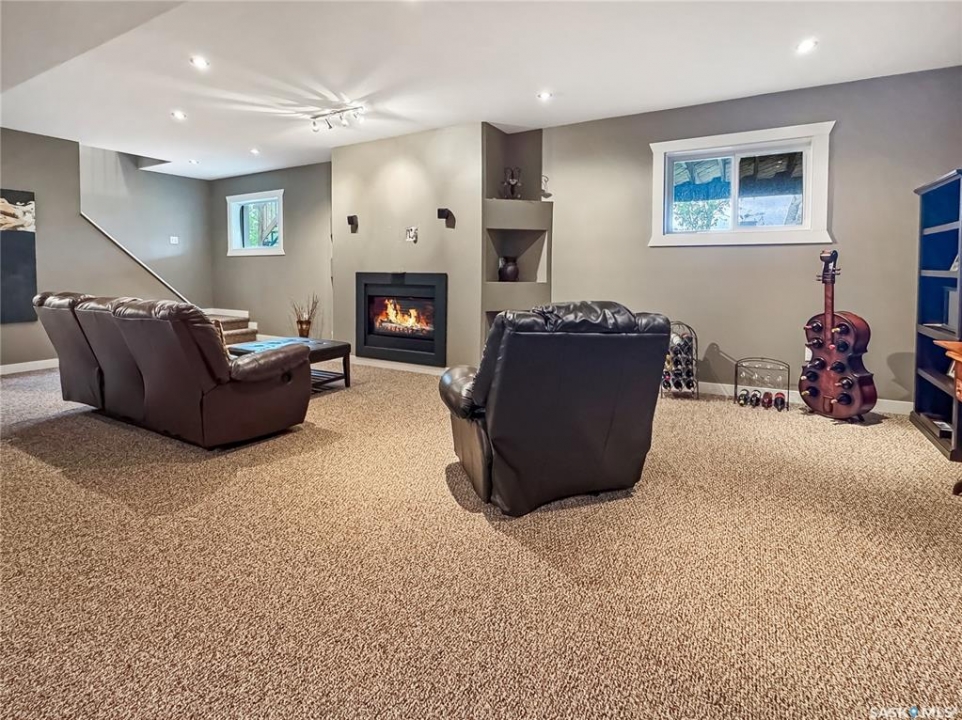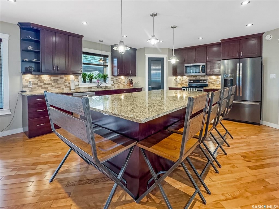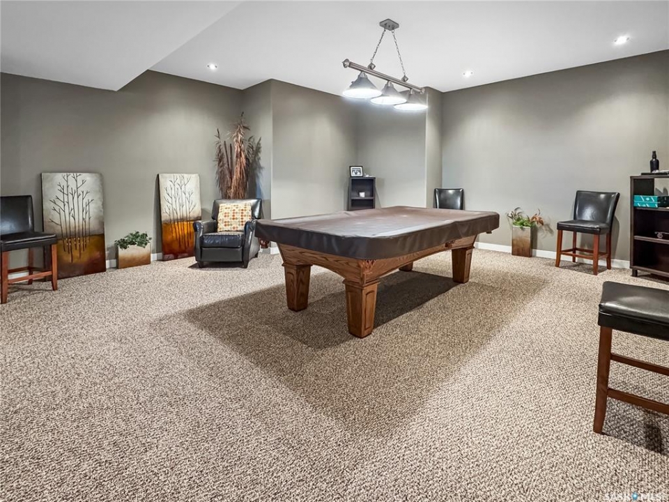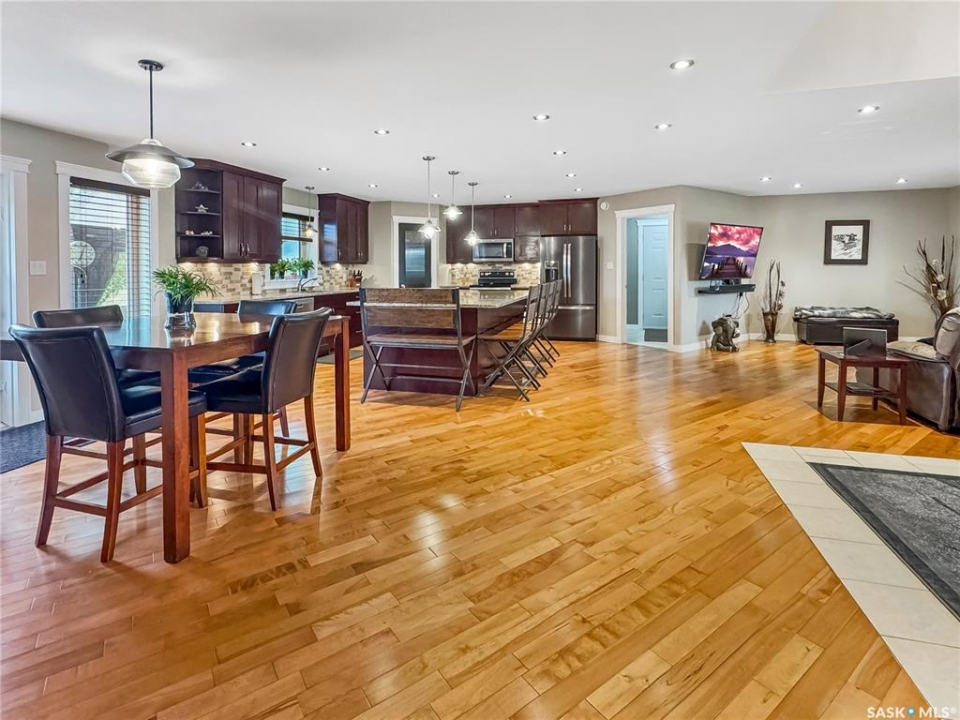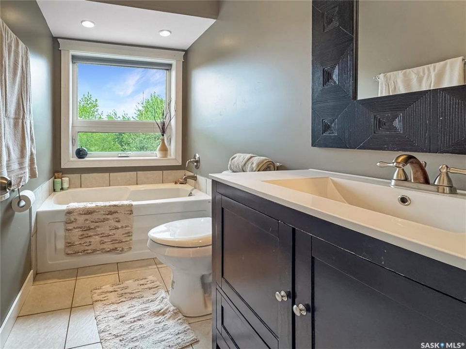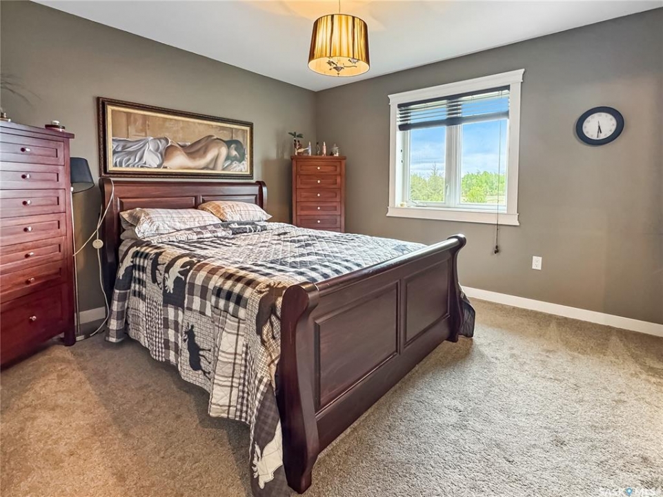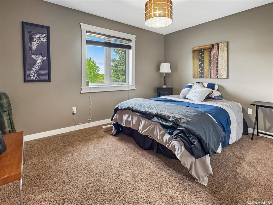 Tucked into the sought-after Battle Ridge Estates, this gorgeous 12.45-acre property offers the perfect mix of modern comfort and peaceful prairie living. From the moment you arrive, this home stands out. A paved driveway leads to a metal security gate, welcoming you into a beautifully landscaped yard equipped with over 100 underground sprinklers to keep everything lush and green. Inside, this spacious 5-bedroom bungalow is built to impress. The main level is constructed with 2x8 walls wrapped in 1.5 inches of Styrofoam insulation, delivering both efficiency and durability. Enjoy elegant finishes throughout including granite countertops, tile and hardwood flooring, and in-floor heat in the basement and garage as well as forced air natural gas furnace to accompany central air conditioning in the summer for the main floor. The heart of the home is the stunning kitchen featuring a massive granite island that flows seamlessly into the dining and living areas. Patio doors lead from the dining space to a large deck overlooking your private view of the natural Saskatchewan plains. The main floor includes three spacious bedrooms, and a luxurious primary suite with walk in closet, a Jacuzzi tub, tiled shower, and dual sinks. Downstairs, the fully finished basement features 9-foot ceilings, an expansive recreation area open to a cozy family room with a natural gas fireplace, two oversized bedrooms, a full bath, and another office or hobby space. The basement is built with 8-inch ICF walls, ensuring long-term strength and insulation. The triple attached garage adds even more value, boasting acid-stained in-floor heated concrete, plus a convenient bathroom—a rare find. There is a massive 40 x 40 pole shed for even more extras storage. Whether you're seeking space, peace, or a high-end acreage lifestyle, this property offers it all. Move-in ready and built for comfort—come experience the acreage life without giving up convenience. Call today to book your private showing.