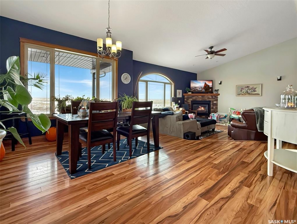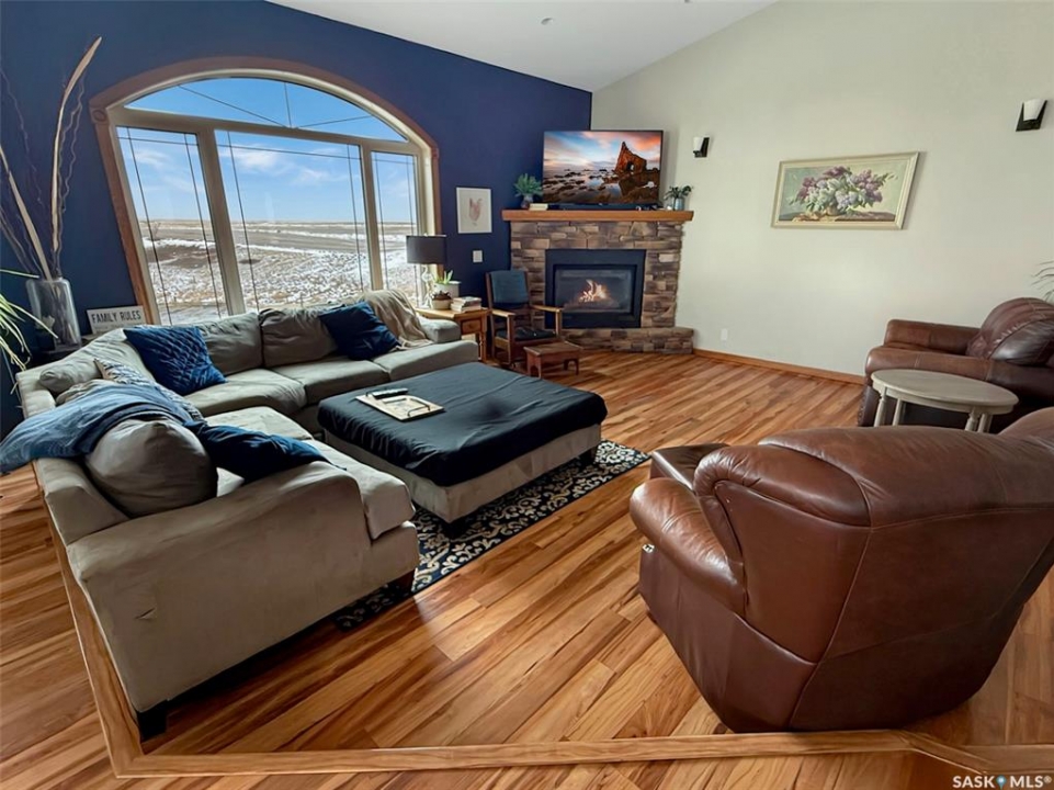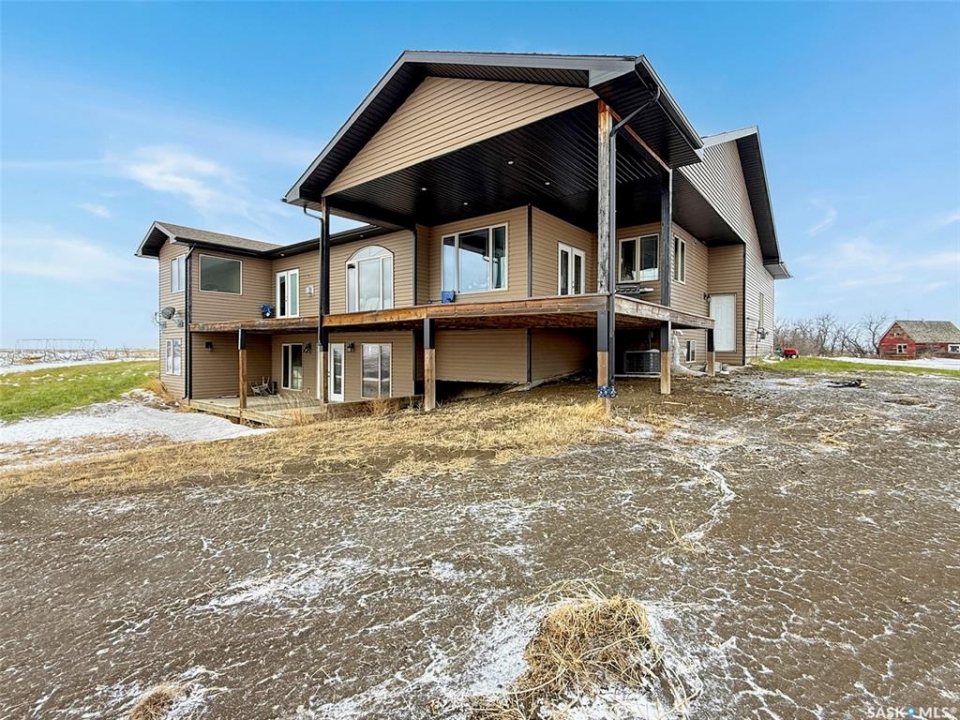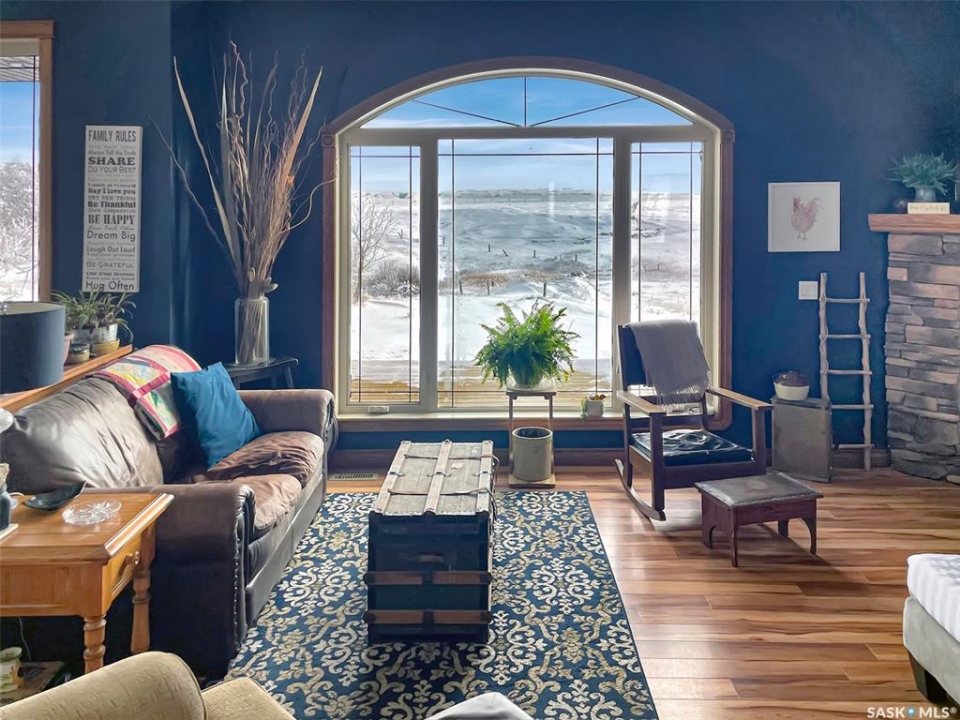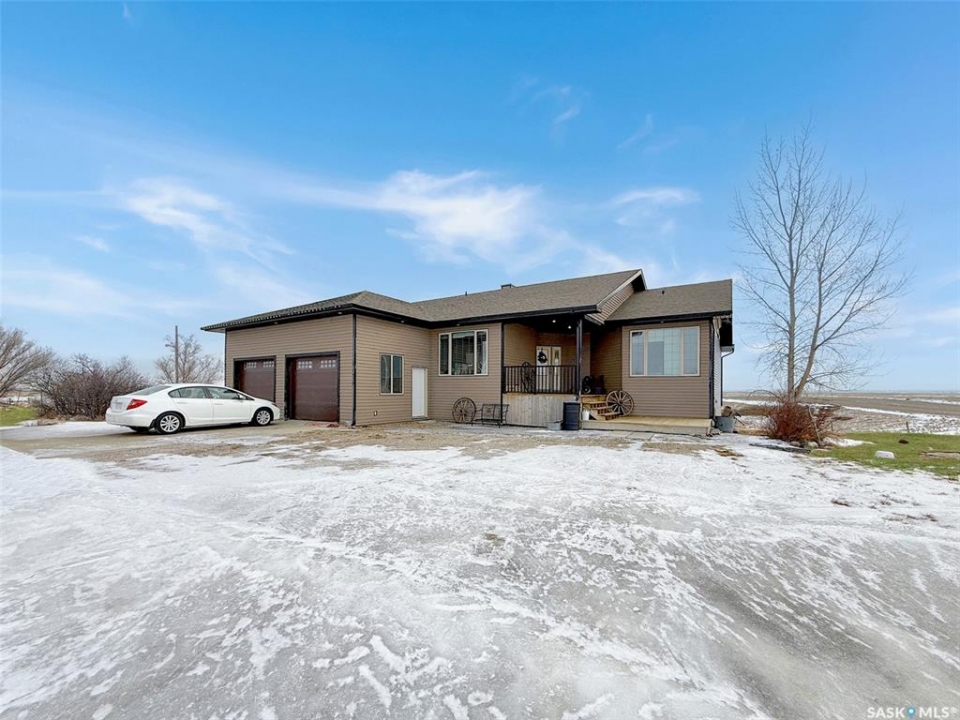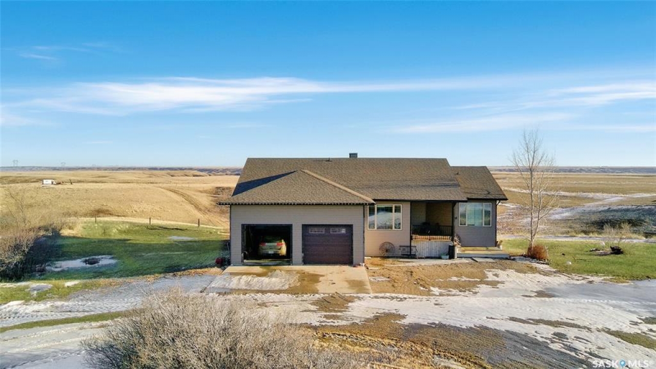 Set on 10.26 acres in the RM of Lacadena, this exceptional 1,800 sq. ft. bungalow is perfectly positioned to capture panoramic vistas of the South Saskatchewan River. Just minutes to the riverside golf course, beach, and lake amenities, the location offers a rare blend of privacy, recreation, and everyday convenience. Inside, a spacious entry opens to an airy, open-concept living space spanning the back of the home—framed by expansive windows, vaulted ceilings, and pot lights that draw your attention straight to the view. A cozy sitting area with a gas fireplace anchors the main living zone, flowing seamlessly into the eat-in kitchen and dining area. Patio doors lead to a wraparound balcony—an ideal setting for morning coffee, sunset dinners, and uninterrupted river scenery. The kitchen features modern cabinetry and a sit-up island designed for effortless entertaining. A rear mudroom adds function, with a convenient two-piece guest bath, main-floor laundry, and direct access to the 27' x 27' insulated attached garage. The main level also offers a bright front office, two additional bedrooms, and a full four-piece bath. The oversized primary suite is a true retreat, complete with a walk-in closet and a four-piece ensuite featuring a jet soaker tub positioned to enjoy the view. The walkout lower level is equally impressive, offering a generous family room with a gas fireplace and abundant natural light, opening to a patio beneath the balcony. Three more bedrooms are located here (two with walk-in closets), along with a large four-piece bath, den, storage, and utility space. Notable upgrades and features include an energy-efficient furnace (approx. 4 years), updated hot water heater, central air, water softener, 200-amp electrical, and central vacuum. The home is connected to the public waterline and also includes an 8,000-gallon cistern. A remarkable setting, a refined home, and a view you'll never tire of, contact today for more details.