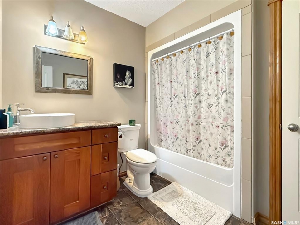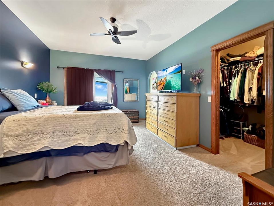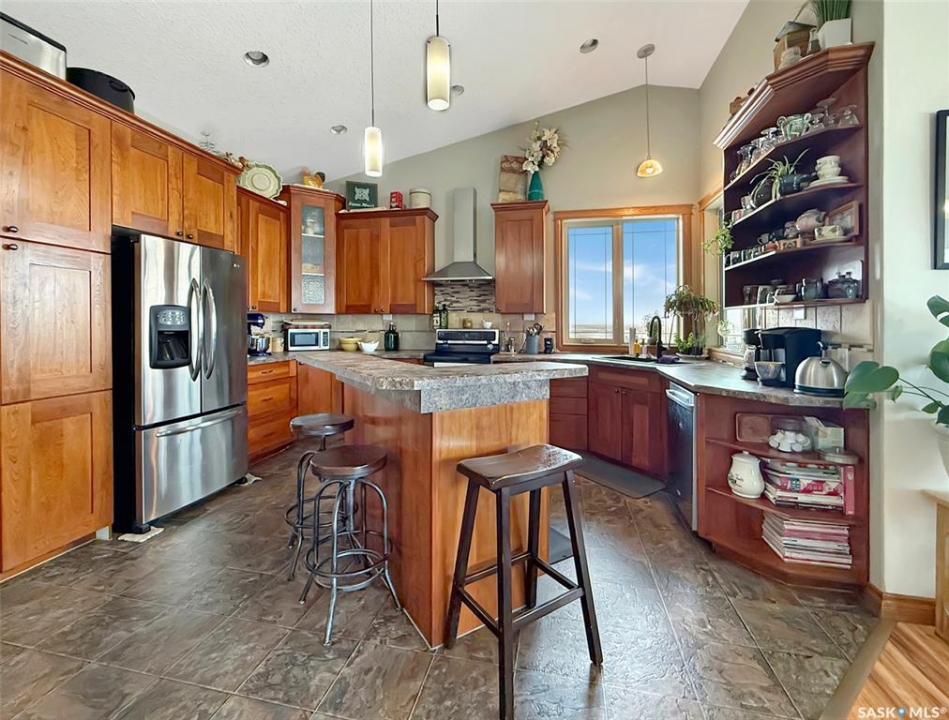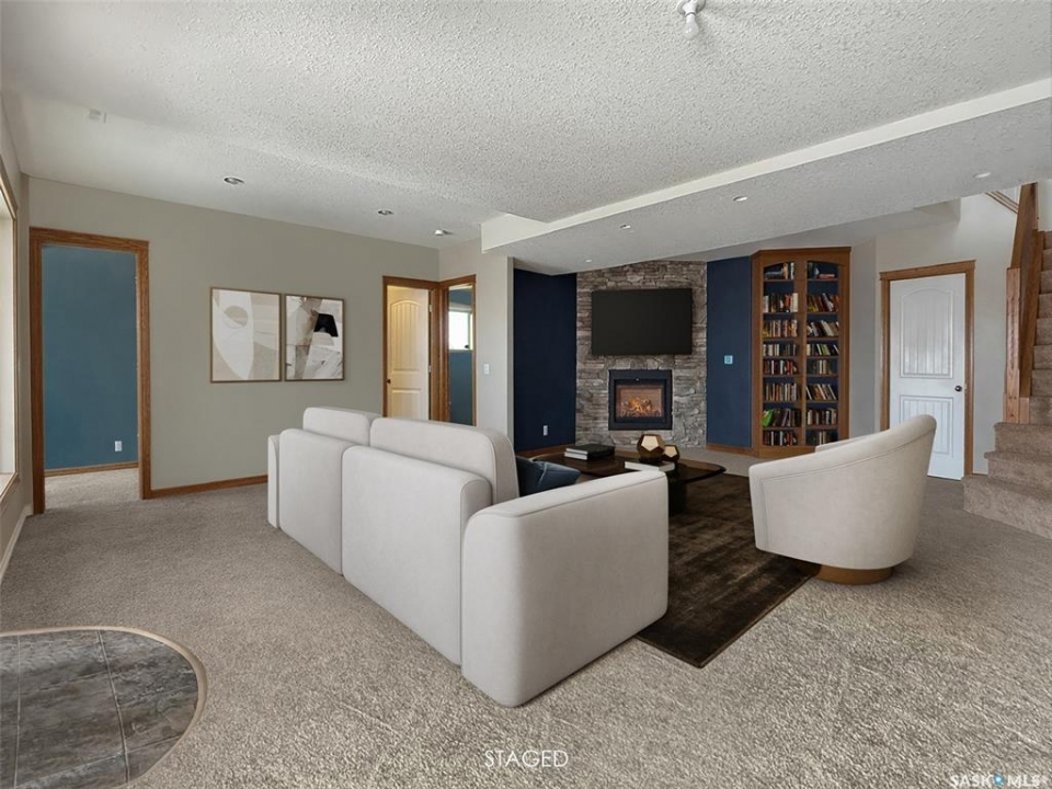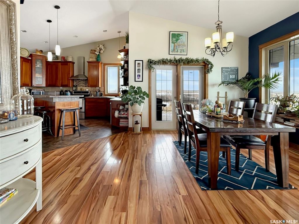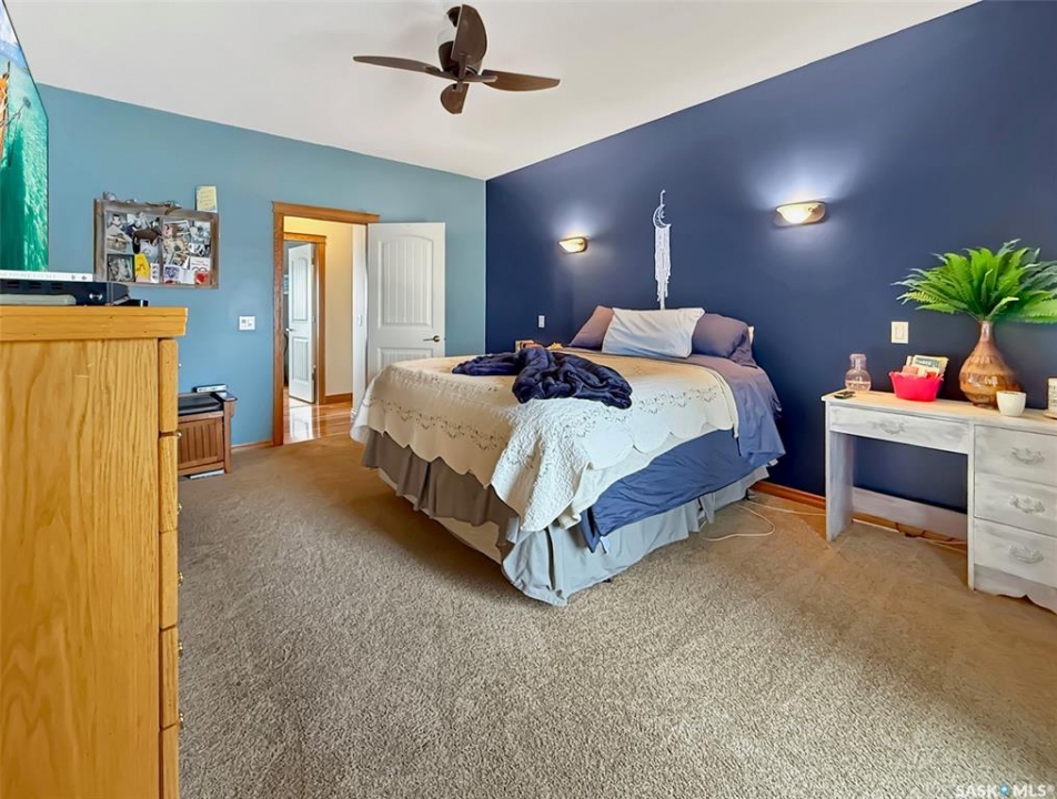 Set on 10.26 acres in the RM of Lacadena, this exceptional 1,800 sq. ft. bungalow is perfectly positioned to capture panoramic vistas of the South Saskatchewan River. Just minutes to the riverside golf course, beach, and lake amenities, the location offers a rare blend of privacy, recreation, and everyday convenience. Inside, a spacious entry opens to an airy, open-concept living space spanning the back of the home—framed by expansive windows, vaulted ceilings, and pot lights that draw your attention straight to the view. A cozy sitting area with a gas fireplace anchors the main living zone, flowing seamlessly into the eat-in kitchen and dining area. Patio doors lead to a wraparound balcony—an ideal setting for morning coffee, sunset dinners, and uninterrupted river scenery. The kitchen features modern cabinetry and a sit-up island designed for effortless entertaining. A rear mudroom adds function, with a convenient two-piece guest bath, main-floor laundry, and direct access to the 27' x 27' insulated attached garage. The main level also offers a bright front office, two additional bedrooms, and a full four-piece bath. The oversized primary suite is a true retreat, complete with a walk-in closet and a four-piece ensuite featuring a jet soaker tub positioned to enjoy the view. The walkout lower level is equally impressive, offering a generous family room with a gas fireplace and abundant natural light, opening to a patio beneath the balcony. Three more bedrooms are located here (two with walk-in closets), along with a large four-piece bath, den, storage, and utility space. Notable upgrades and features include an energy-efficient furnace (approx. 4 years), updated hot water heater, central air, water softener, 200-amp electrical, and central vacuum. The home is connected to the public waterline and also includes an 8,000-gallon cistern. A remarkable setting, a refined home, and a view you'll never tire of, contact today for more details.