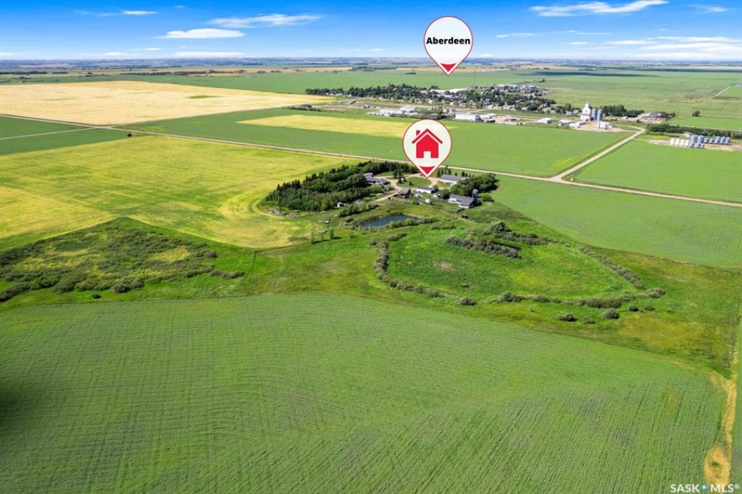 153.84 Acres located at Aberdeen Sask. Features a 1910 Sq. Ft. Bungalow with modern appliances and several custom features. The home is on City sourced water and has Gas heat. There is a large shop and several workshops and an older Barn suitable for horses. There are several hopper Bottom bins and a Park like setting with lots of space for RV"s and rec vehicles.