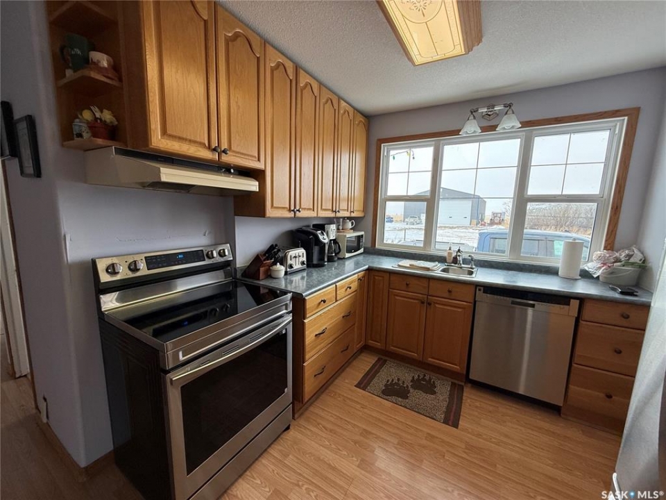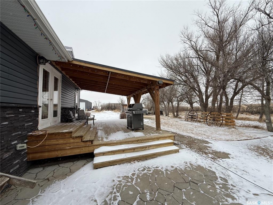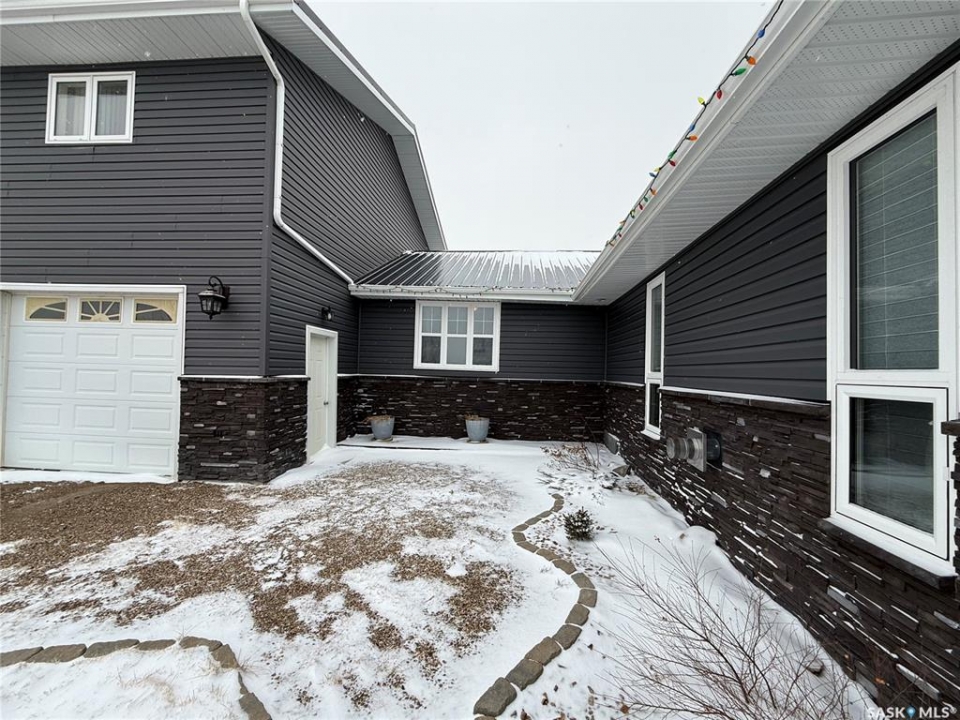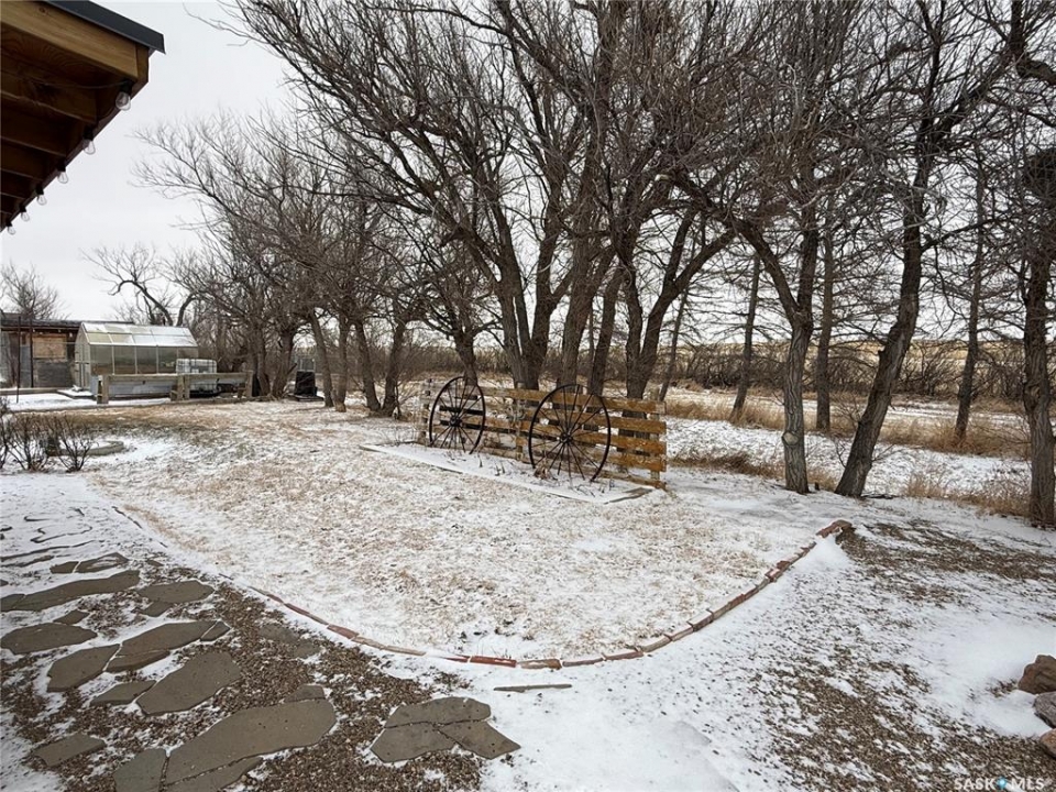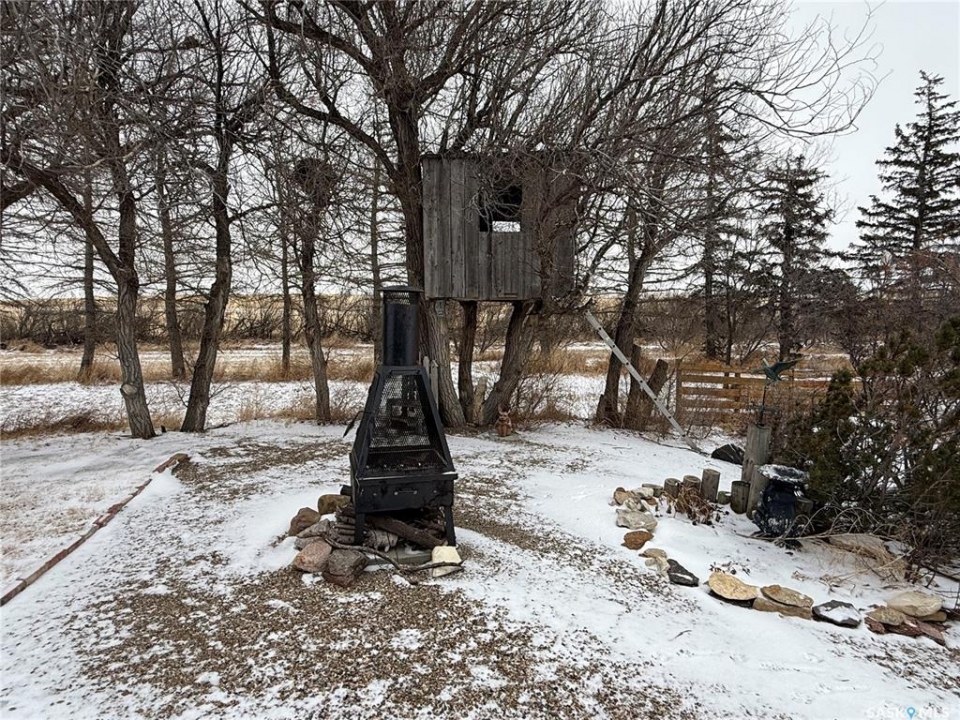 SE-04-25-20 W3 Space, Comfort & Functionality. Located just 4.5 miles south of Eston, this beautifully maintained acreage offers the perfect blend of space and rural charm. Featuring approx. 1,900 sq. ft. two-storey home (originally built in 1961 with a well-planned addition in 1998) Step inside to a large open-concept main floor that seamlessly connects the kitchen, dining, and living areas—perfect for everyday living and entertaining. The sunken living room is a cozy highlight, complete with a stunning stone radiant gas fireplace. The spacious dining area features garden doors that lead out to a covered deck, overlooking the beautifully landscaped yard. The main level also includes a useful bedroom (ideal as an office or den), a bright and versatile office/gym space filled with natural light, and a 4-piece bathroom with a jetted tub and tiled surround. Convenient access to the attached 30' x 30' double garage is also found on this level. Upstairs, you'll find three large bedrooms, including an expansive primary suite with windows on both sides and a walk-in closet. Most of the home has been upgraded with new triple-pane windows for improved efficiency and comfort. The basement offers even more functional space, including a family room, laundry/utility area, additional office space, and a 3-piece bathroom. Outside, the property truly shines. Enjoy the meticulously landscaped yard featuring stonework, tiered steps, mature trees, and a new covered deck. Additional features include: 44' x 76' heated shop with gas radiant heat, concrete floor, oil catch drain, and 24' x 18' power doors. The home has a metal roof and updated siding with stone accents. Cement patio area. Dugout located behind the shop. Large shed, barn, and greenhouse for added versatility .This is a rare opportunity to own a well-equipped acreage in a great location—offering space, privacy, and everything you need for country living.