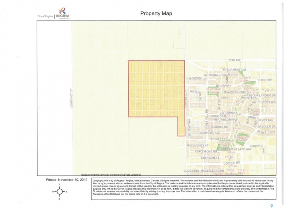 135' x 125' lot (or the same size as 5 lots, 25' x 125') in Devonia Park or Phase IV of West Harbour Landing (located west of Harbour Landing and south of 26th Avenue). This parcel is located on the far west side of 'Devonia Park'. Devonia Park is a quarter section of land originally subdivided into 1,400 lots in 1912. The land was never developed. Investment opportunity only. Brokerage sign at the corner of Campbell Street and Parliament Avenue. GST may apply to the sale price. There may be other costs once the land is developed. More information in the 'West Harbour Landing Neighborhood Planning Report'.