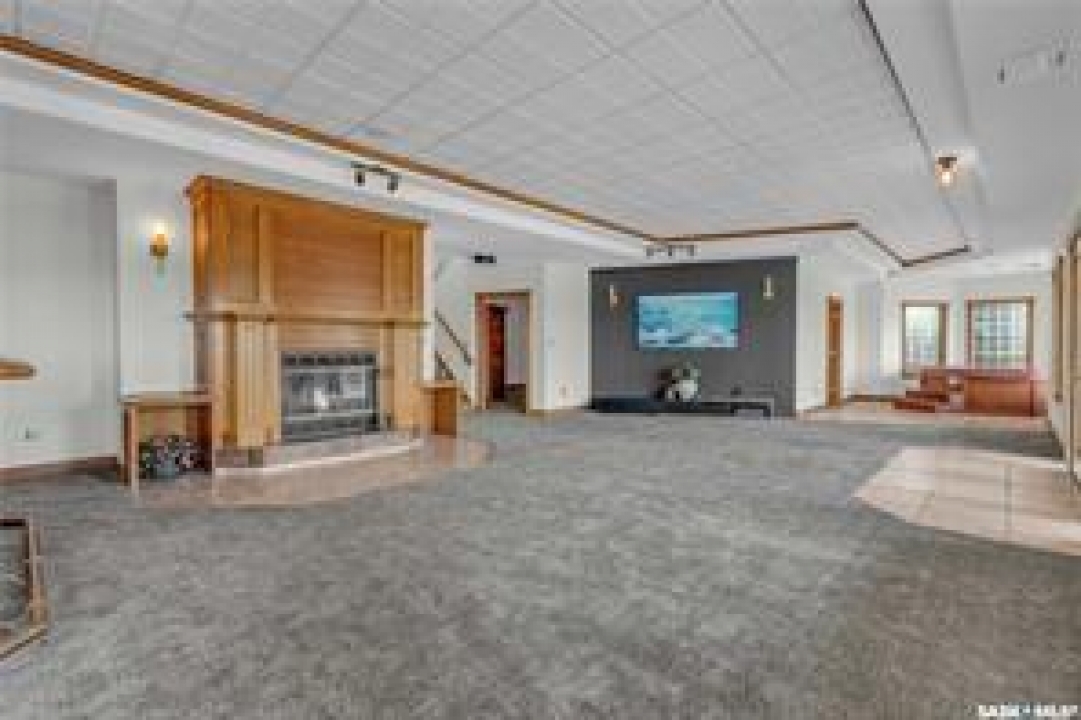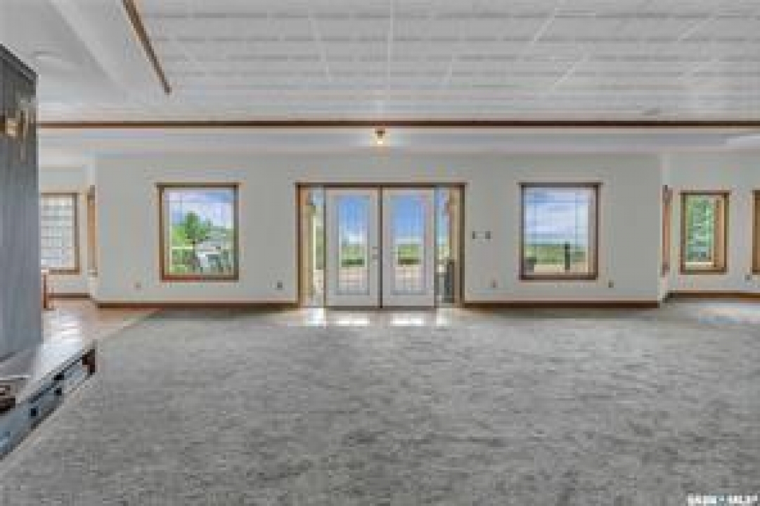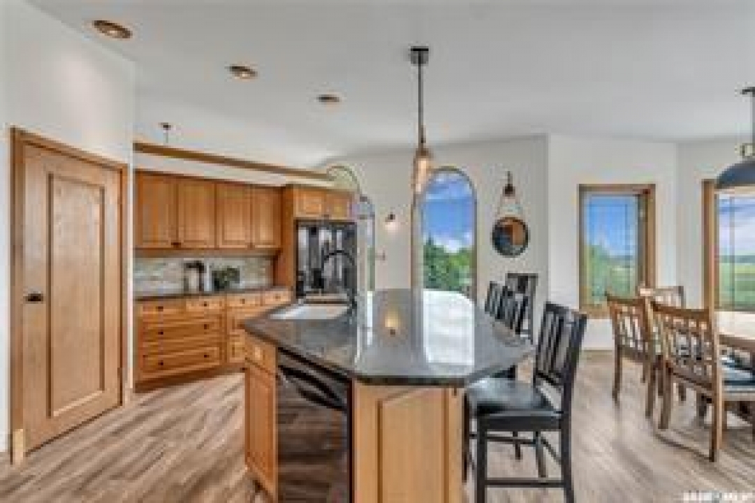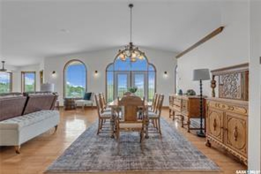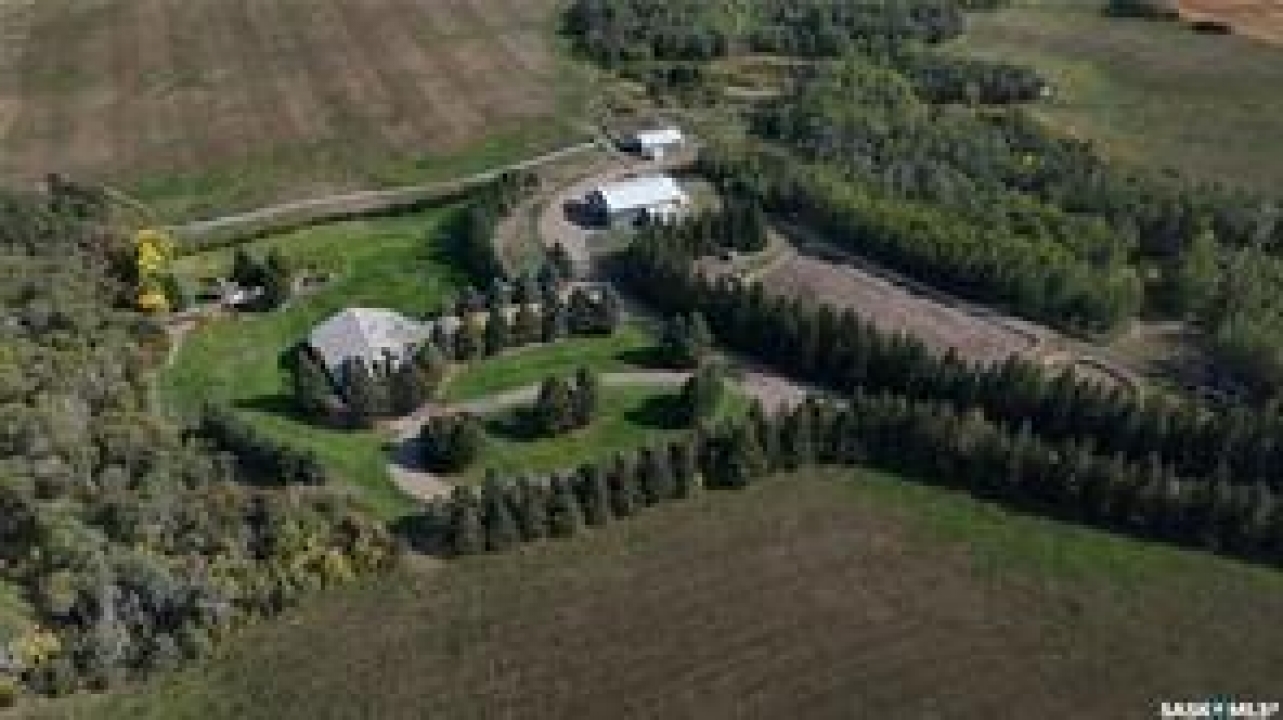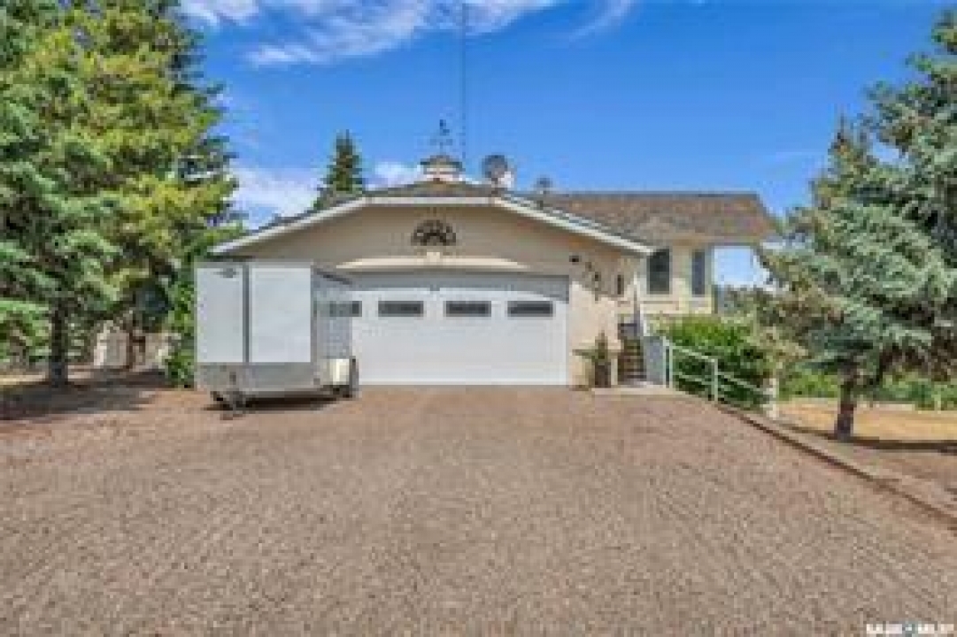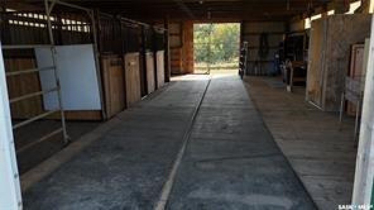 Welcome to your own private equestrian retreat! This breathtaking 79-acre property, a stone's throw from the Battlefords, offers the perfect blend of luxury, comfort, & functionality. Whether you're a horse enthusiast or simply seeking tranquility in nature, this pristine acreage promises the ultimate lifestyle. When you arrive, you're greeted by a grand courtyard entrance, setting a tone of elegance. The open floor plan boasts abundant natural light, between living areas, making this home perfect for entertaining. A stunning three-sided fireplace is the centerpiece of the living space, providing warmth & ambiance on chilly evenings. This spacious four-bedroom, three-and-a-half-bathroom home is designed with both beauty and convenience in mind. The wet bar is perfect for hosting friends & family, while the large entertainment areas, inside & out, offer plenty of room for gatherings. The lower level has a feature wall including a 75-inch Samsung frame TV with non-reflective screen that displays wall art when not in use, surround sound speakers are located on the wall & outside on the deck. The walkout basement extends your living space into the serene outdoors, where a beautiful pond and gazebo await, creating a backdrop for relaxation & peaceful reflection. The property is also a dream for horse lovers, with an impressive barn, stables, riding arena—everything you need to keep your horses in top shape & enjoy the equestrian lifestyle to the fullest. The tranquil surroundings, including the lush fields & serene pond area, create the ideal setting for both you & your animals. This is more than just an acreage—it's a lifestyle. Whether you're riding, relaxing by the pond, or entertaining guests in your beautiful home, you'll experience the ultimate in country living & all the amenities you need. A 48x 40 heated shop also includes living quarters for a hired hand or a guest space for family & friends. The entry to the property has a large, controlled iron gate.