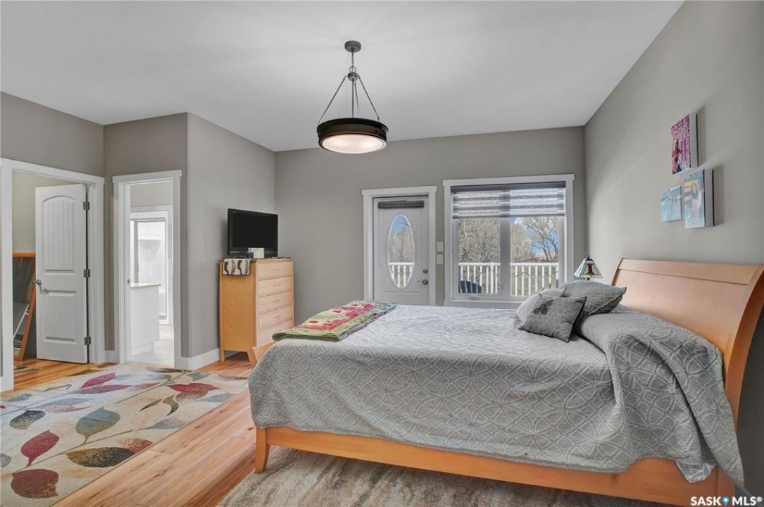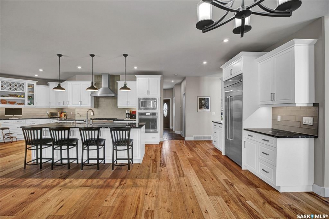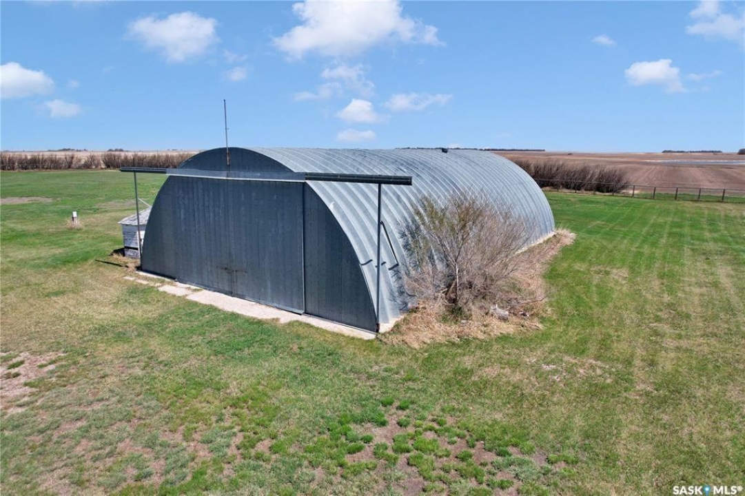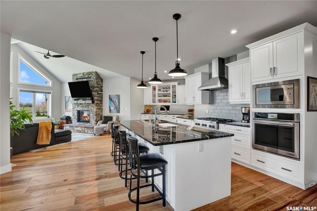 This beautiful, private acreage features 5 bedrooms, 4 bathrooms, a triple-car attached garage, and multiple outbuildings. Located just 22 minutes from Saskatoon, this acreage sits just outside the town of Delisle which features all amenities such as schools, grocery, gas, recreational activities and more. This 2020 built bungalow was customized with high building standards. The veranda at the front of the home provides entry into both the dining room and front hall. The spacious front entry gives access to the triple attached heated and insulated garage, half bathroom and main floor laundry room. The kitchen offers a large island, custom soft closet cabinets and drawers, glass tiled backsplash, quartzite countertops, large pantry and Jenn Air appliances. The kitchen is open to the family room with vaulted ceilings, a propane fireplace and large windows providing both a scenic view and an abundance of natural light. The sun room is fully insulated and can be used year round with a space heater or by leaving the doors open to the main living space. The great room boats 18ft ceilings and a second propane fireplace. Down the hall are three bedrooms including the master suite and the main bathroom. The master offers a walk in closet, five-piece ensuite with a water-air tub, separate stream shower, double sinks and access to the back deck. The outbuildings include the following: Quonset (42 X 70), Shop (20.5 X 33), Horse Stable, 24.5 X 14.5). The workshop is heated and insulated. The large Quonset is finished with a concrete floor and large double doors. The horse stable features two sliding doors and is perfect for horses. The home is finished with 50 year fiberglass shingles, commercial grade ROXUL insulation, triple pane windows, fiberglass doors, high efficient furnace and 100 gallon hot water tank with circulation system. There is a two stage system septic field with pump out and 1500 gallon – fiberglass tank.
