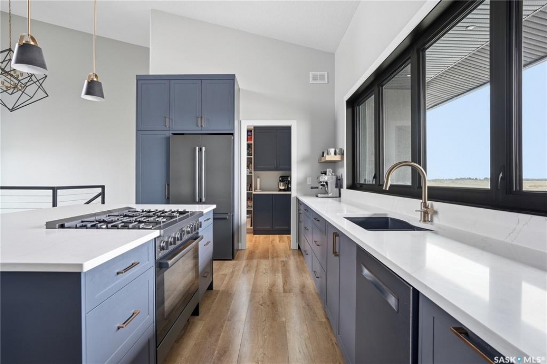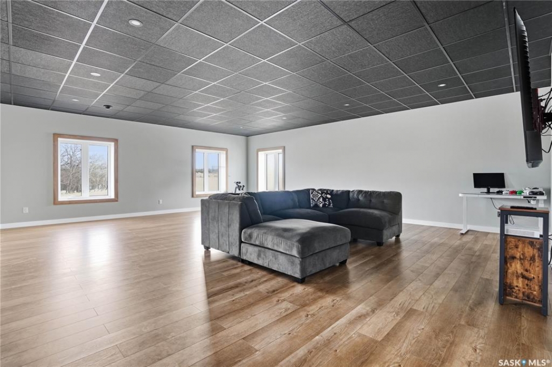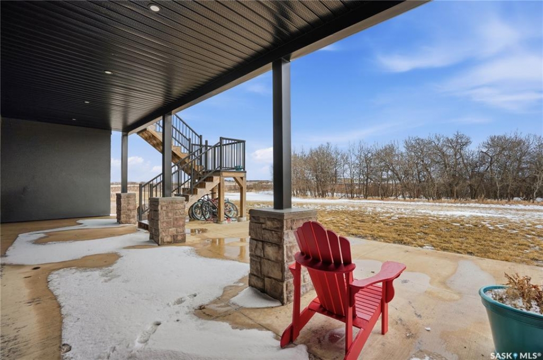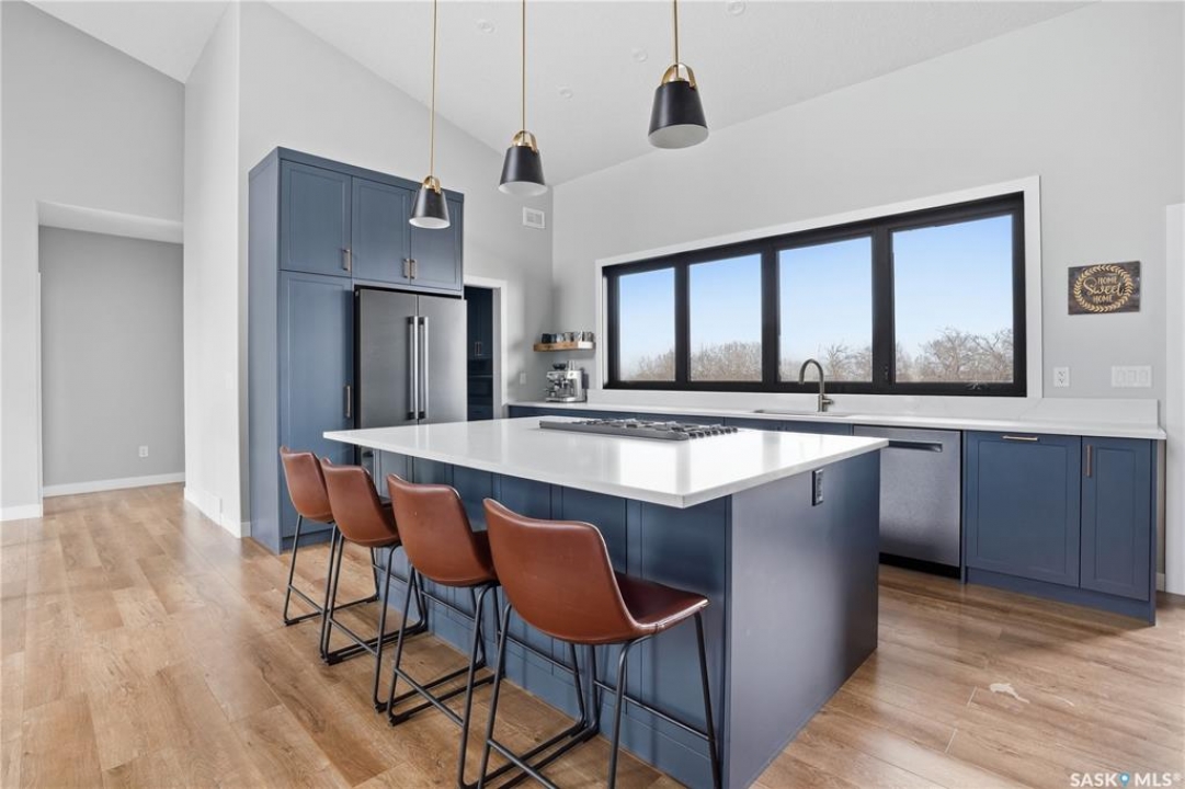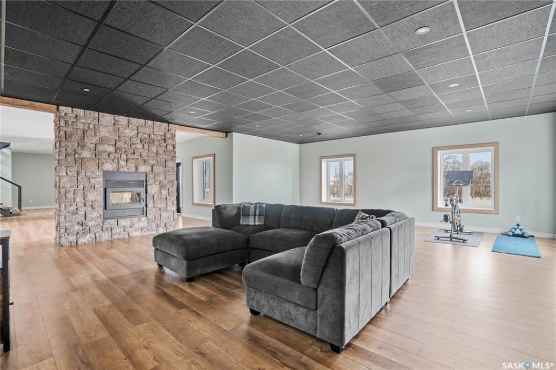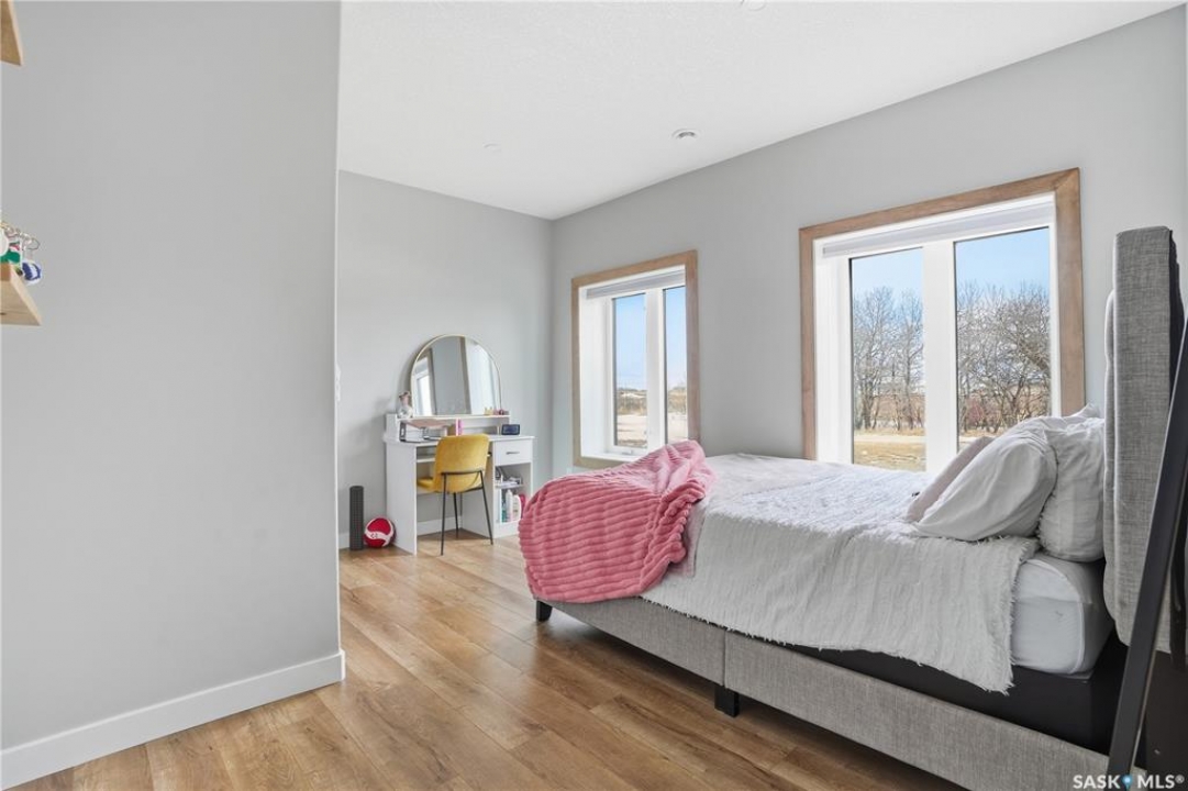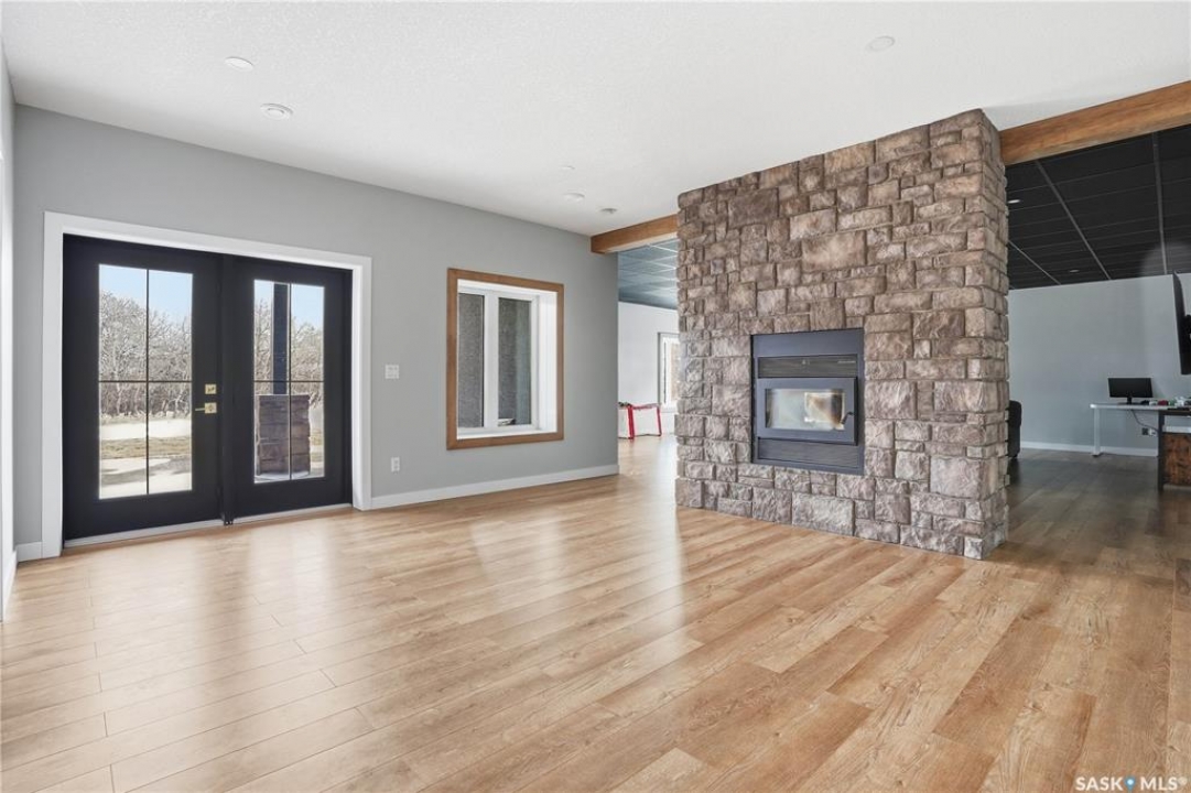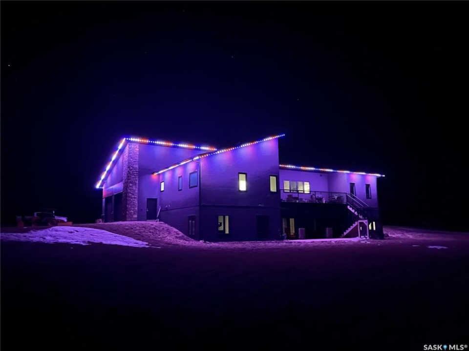 Welcome to acreage life on just over 10 acres with direct highway access, only 30 minutes to the city. This 2022 custom home was built with extraordinary craftsmanship and features throughout. Upon entering the front entrance, you are welcomed into an expansive great room with tons of natural light and towering vaulted ceilings. The custom kitchen is east facing with plenty of windows allowing you to enjoy the morning sun either sitting at the huge quartz topped island or through the access and on your large deck. The island houses a 36" bosch gas range for the fussiest of chefs. Plenty of storage is everywhere with plenty of cabinetry as well as the walk-in pantry. The dining area supports a large table for large family gatherings. The living room is focused on a gas fireplace with room for a flat-screen above. The back entrance comes in off of your huge 36x32 heated and insulated garage with a 2-pce bath and a convenient locker closet room. The Primary bedroom is well appointed with a 5 pce ensuite, featuring his/her sinks, a doorless shower and soaker tub. A walk-in closet, with direct access to the main floor laundry is a well planned touch. The other side of main floor features 2 large bedrooms and 4 piece bath. Downstairs you will find plenty of natural light from the walk-out deesign. A huge rec-room is centered around wood burning fireplace. A well lit office, 4th bedroom, 3 piece bath with custom shower and wet bar round out the basement. The property runs off of town water, is primarily supplimented with solar electricity and has in-floor heat throughout basement, garage as well as ensuite and main bath upstairs. Too many features to list them all, book your personal showing today.