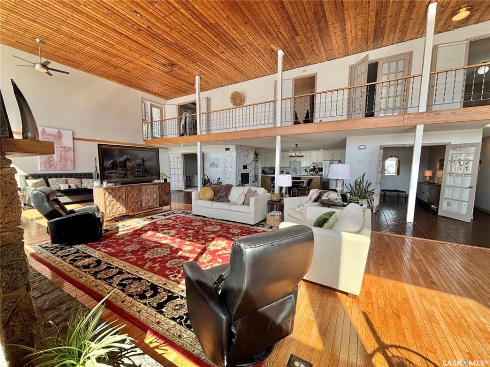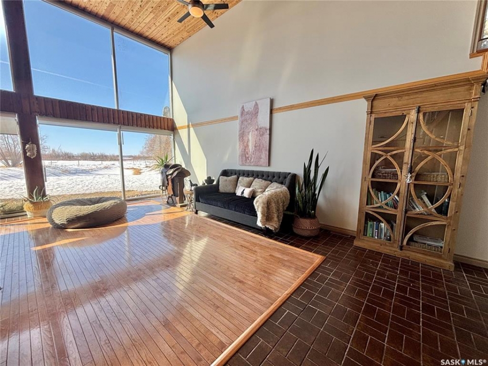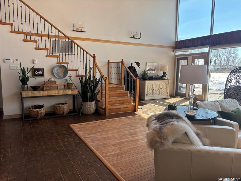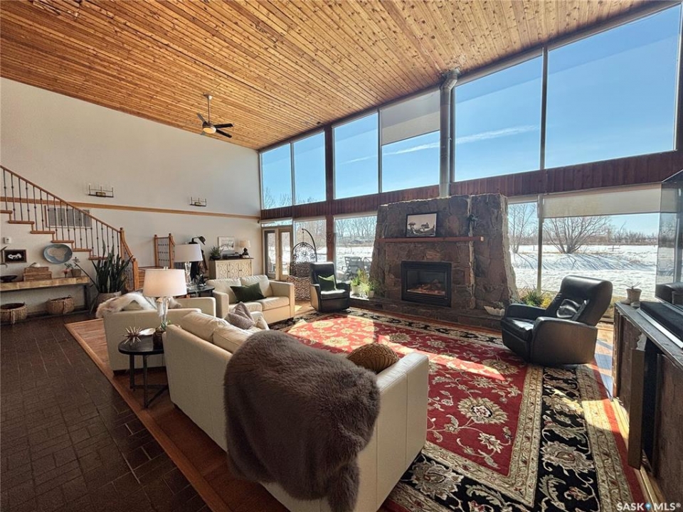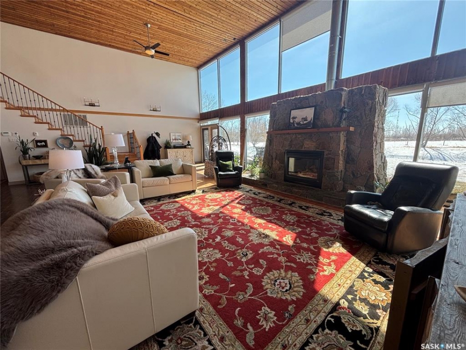 This property offers a rare combination of peaceful country living and modern amenities! Step inside to a bright, open-concept layout with soaring ceilings, expansive south-facing windows that flood the space with natural light and a welcoming feel. The living room is the heart of the home, featuring a stunning fireplace and room to create multiple spaces in one. The newly renovated kitchen blends modern design and everyday function. Complete with updated cabinetry, stainless steal appliances, plenty of quartz counter space, designated desk area and a large walk in pantry. Open to the dining room and living area is the perfect spot for family suppers and or entertaining!!! There is a family room and office with French doors off the main area and a three piece bath plus a dry sauna to finish off the main floor!!! Upstairs there are two good sized bedrooms, 4 piece bath and a designated laundry room! Two direct entry garages and a large sunroom that can be used for storage or a green house if you wish.The large primary bedroom has a walk in closet, beautiful decorative fireplace, wood beams and a three piece bath. Patio doors lead you out to your own oasis with a hydro pool so you can cool off or warm up in every season. The picturesque acreage has equestrian-ready amenities including a barn, riding pen and fenced areas—ideal for horse enthusiasts. Enjoy quiet mornings, wide-open skies, and the beauty of nature right at your doorstep. With 16.31 acres there's plenty of room to create whatever you wish.